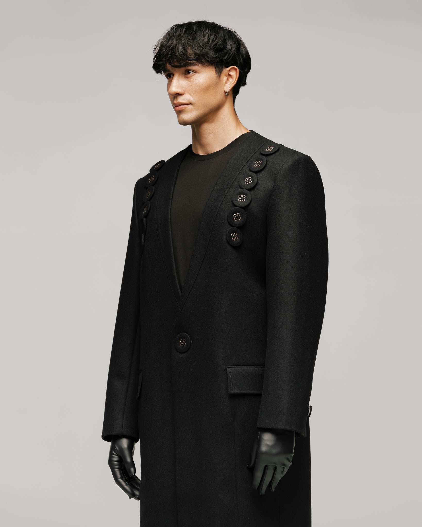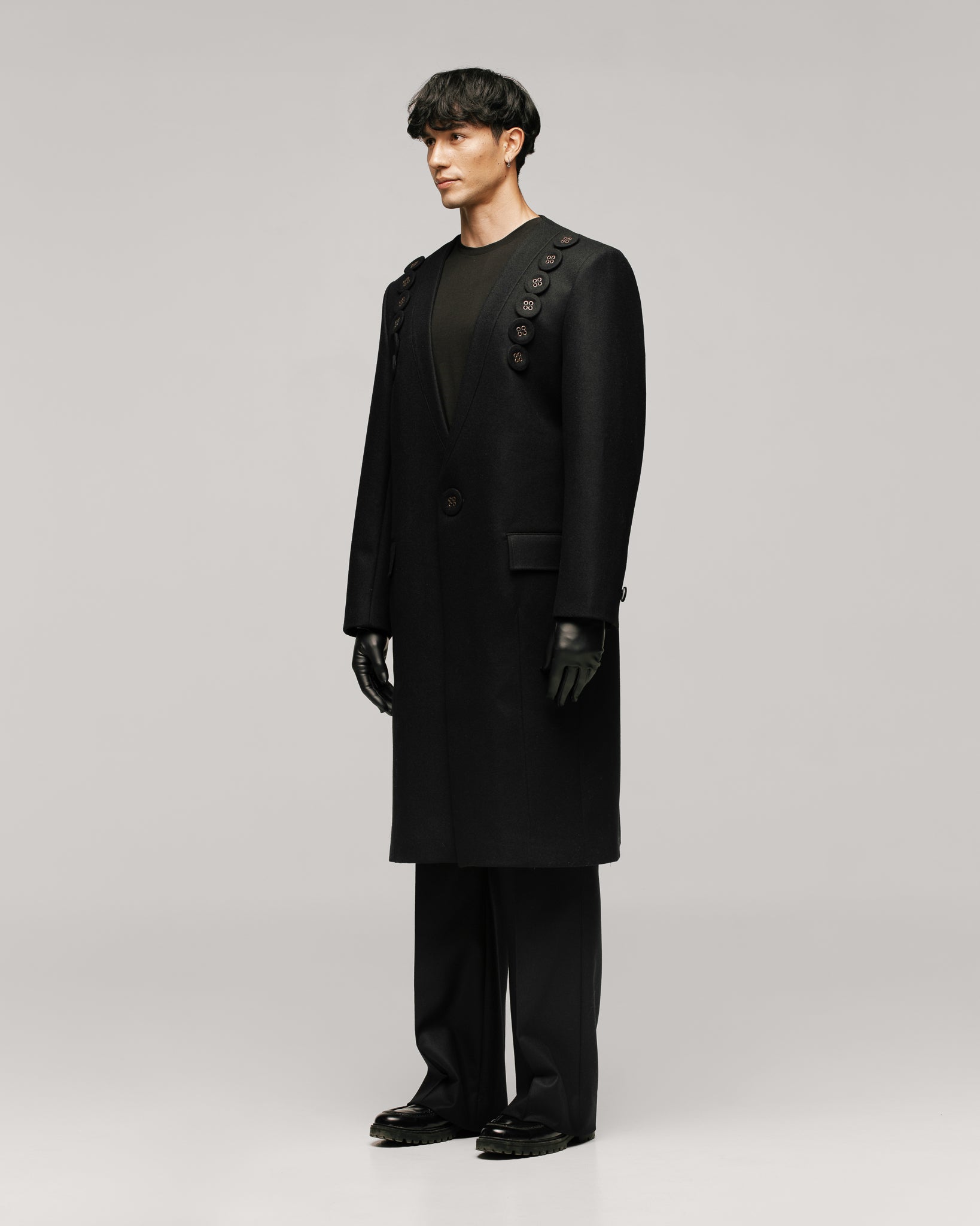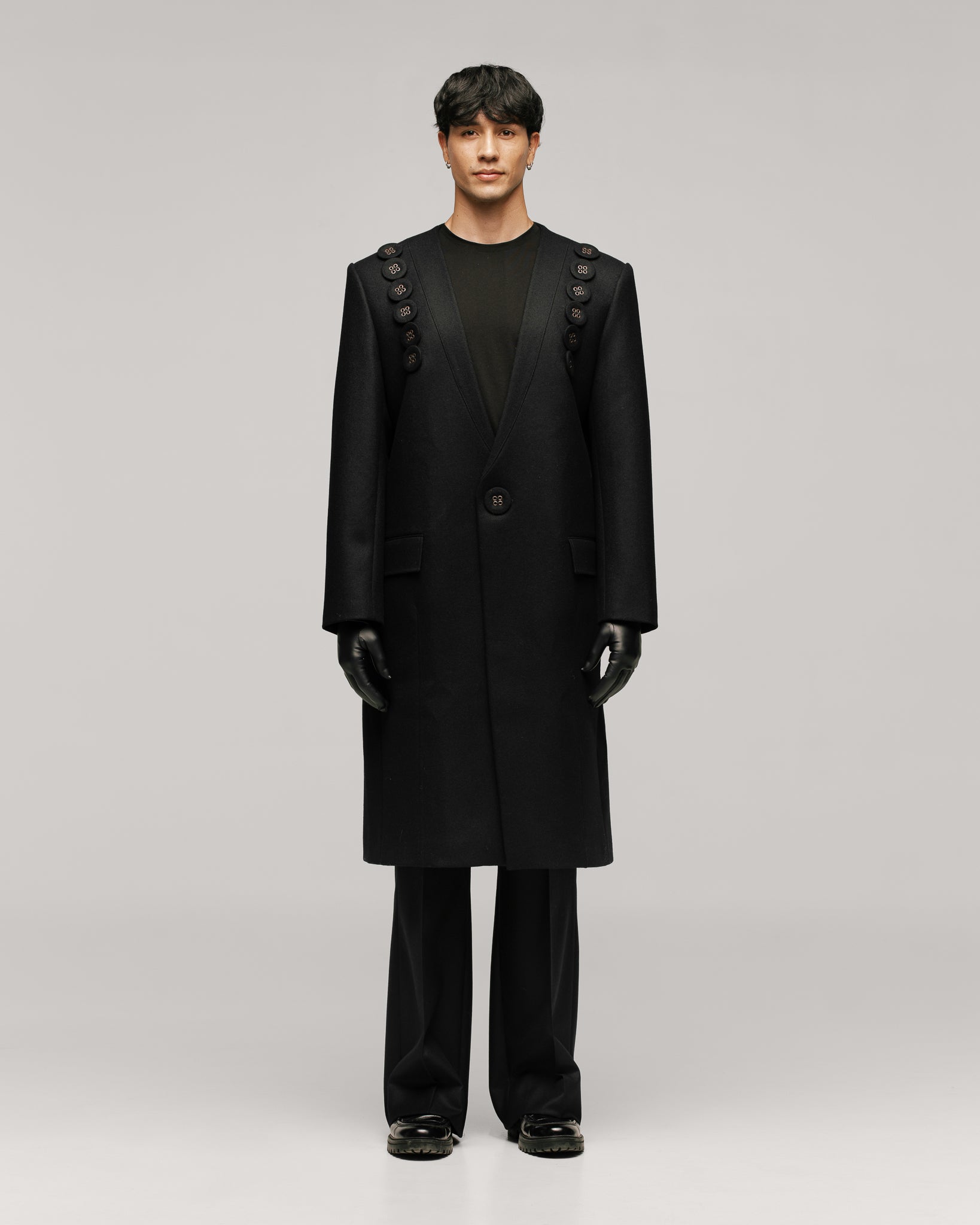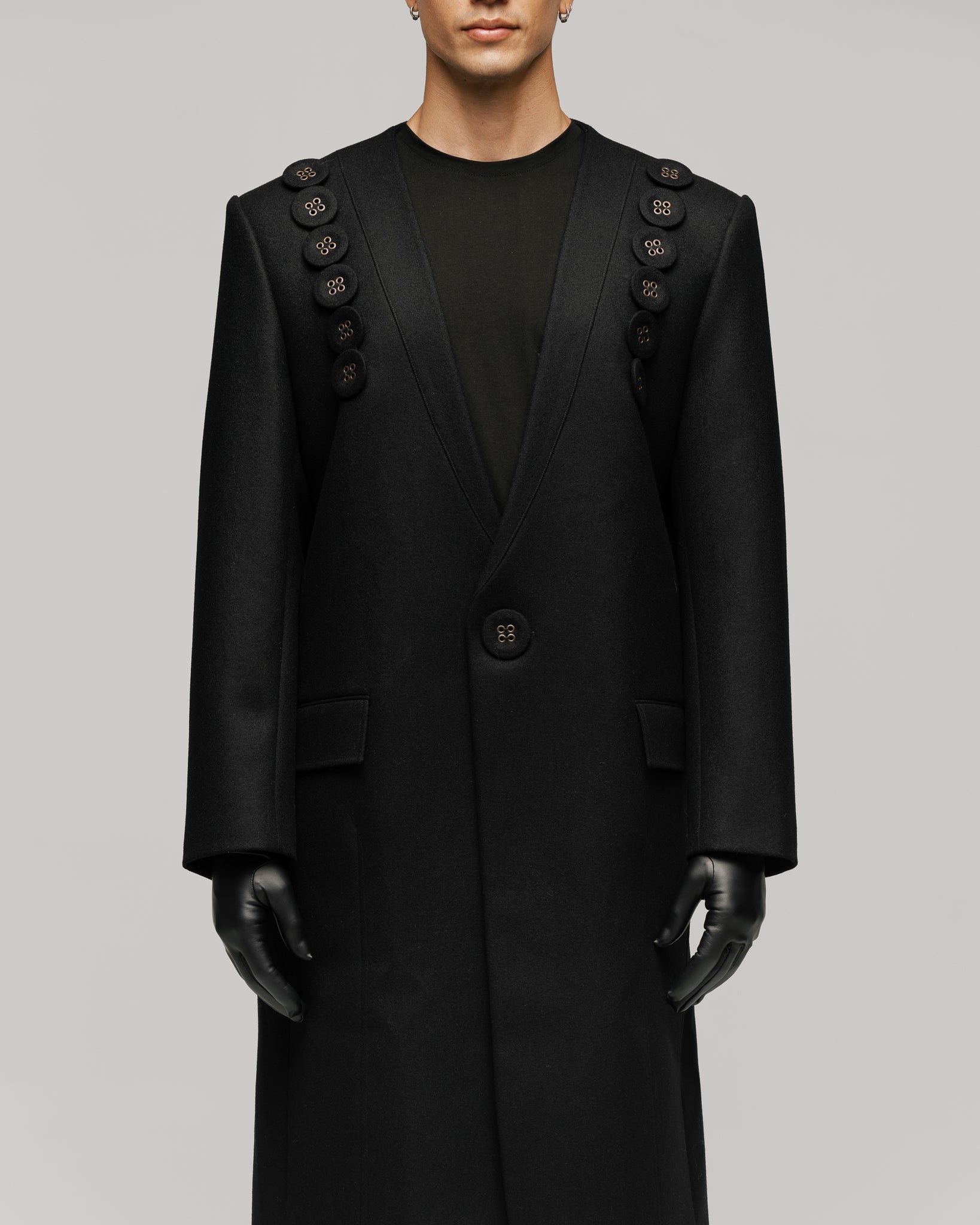 Abrigo largo en paño negro de silueta recta y hombros estructurados. Escote en V profundo y cierre frontal con un solo botón forrado. Botones decorativos forrados en los hombros dispuestos de forma simétrica. Bolsillos de tapa a la altura de la cadera. Interior forrado en viscosa.