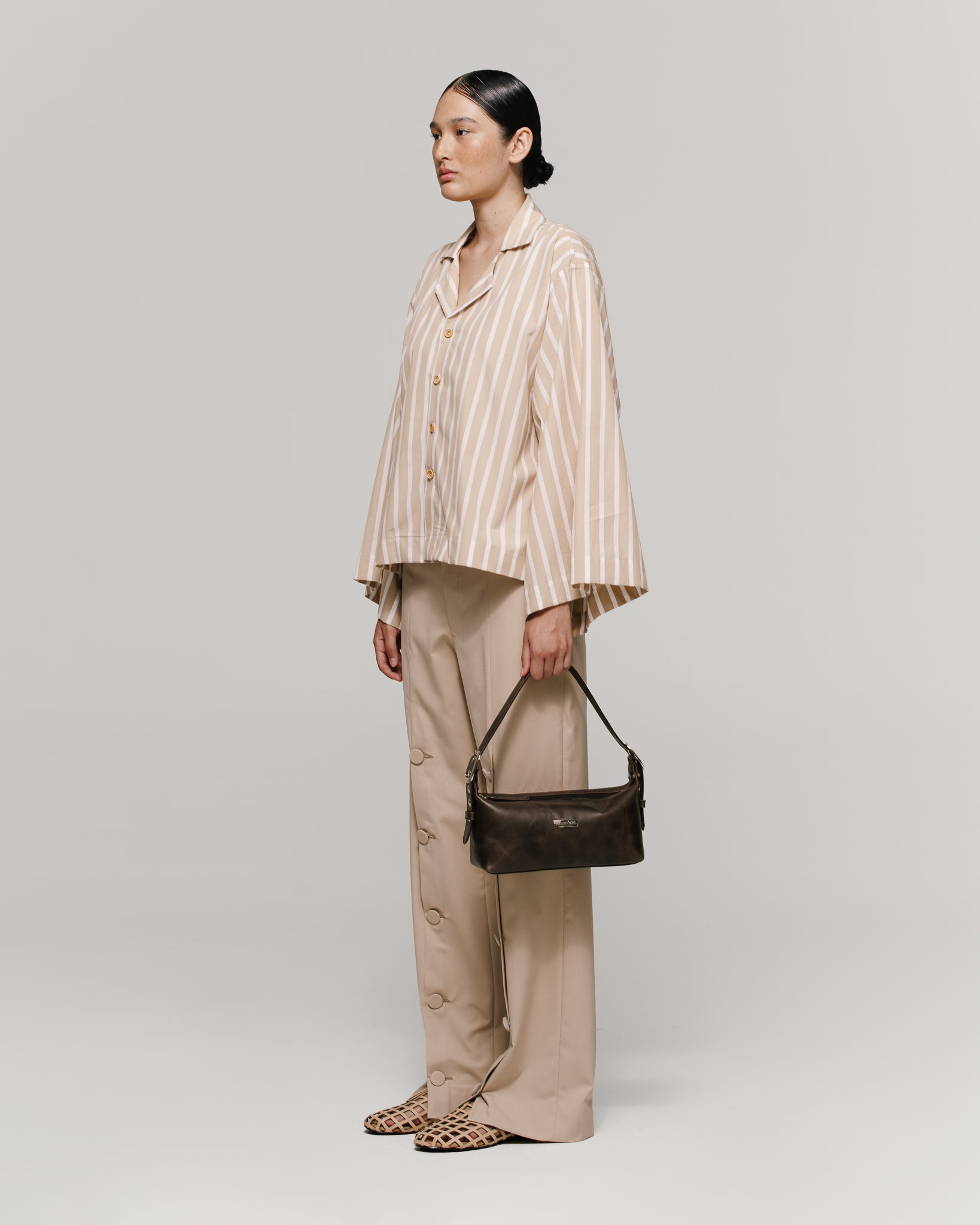 Camisa en algodón de líneas, de cuello sport, botones expuestos de madera y hombros caídos. Silueta boxy amplia. Presenta bocamangas estructuradas prolongadas.