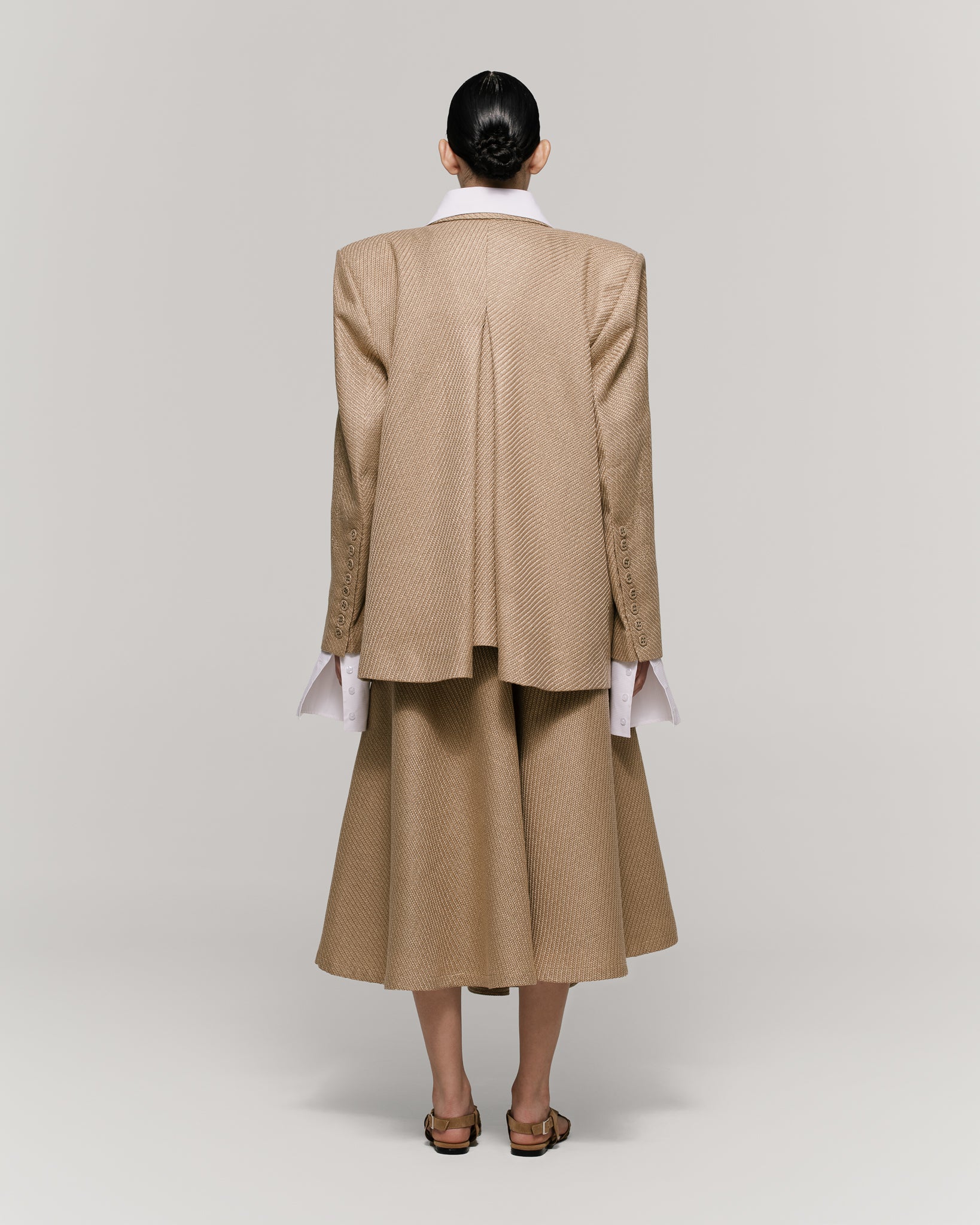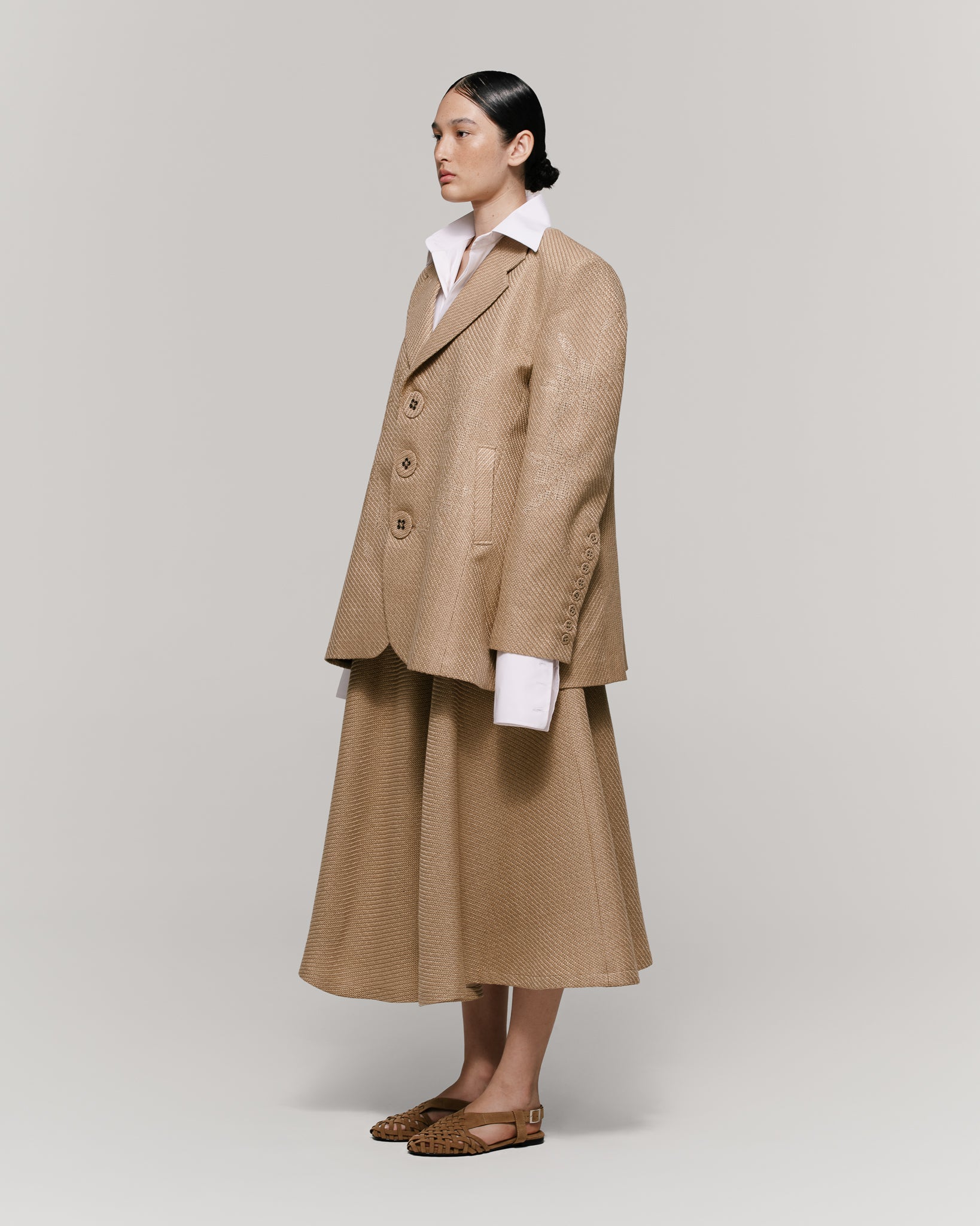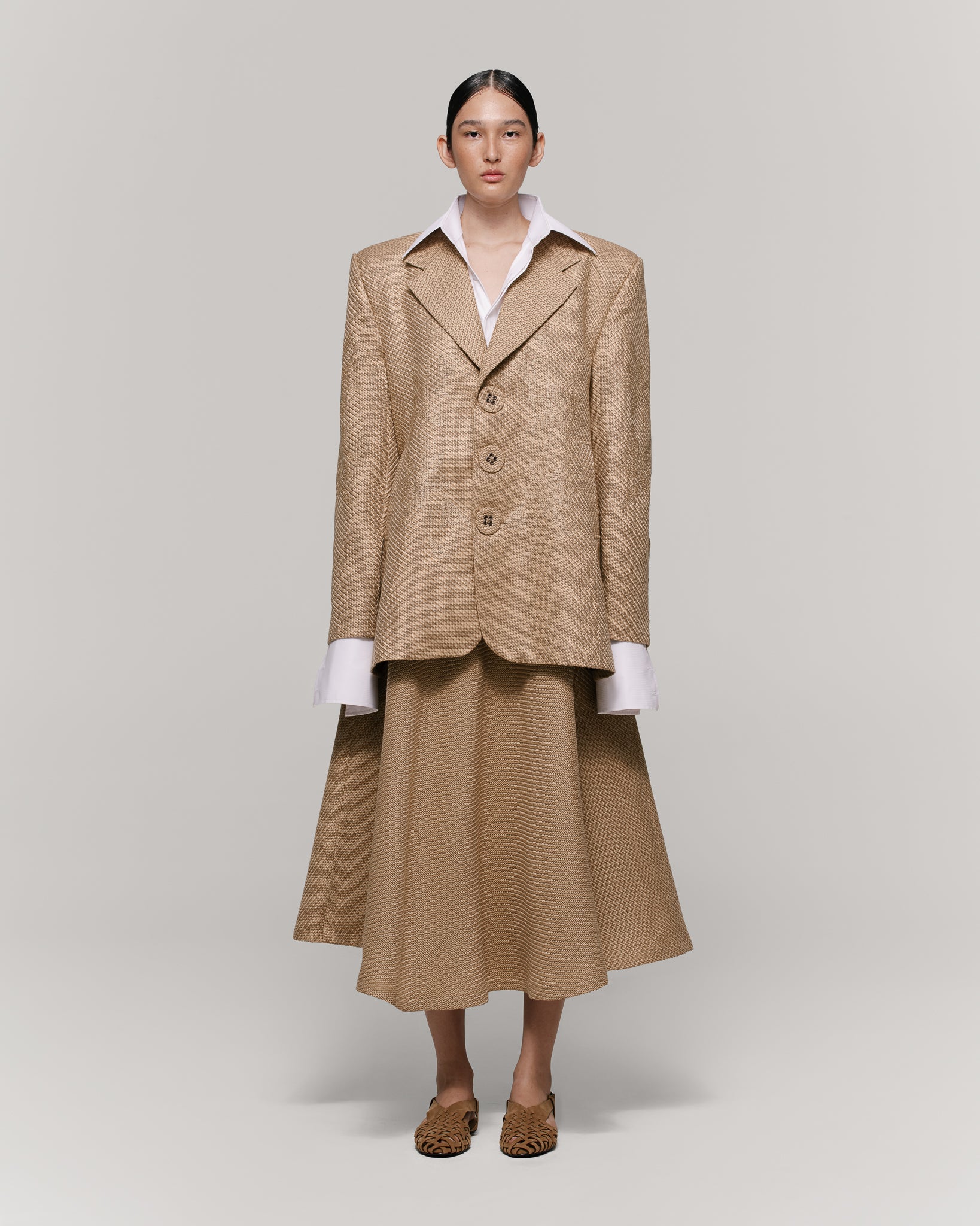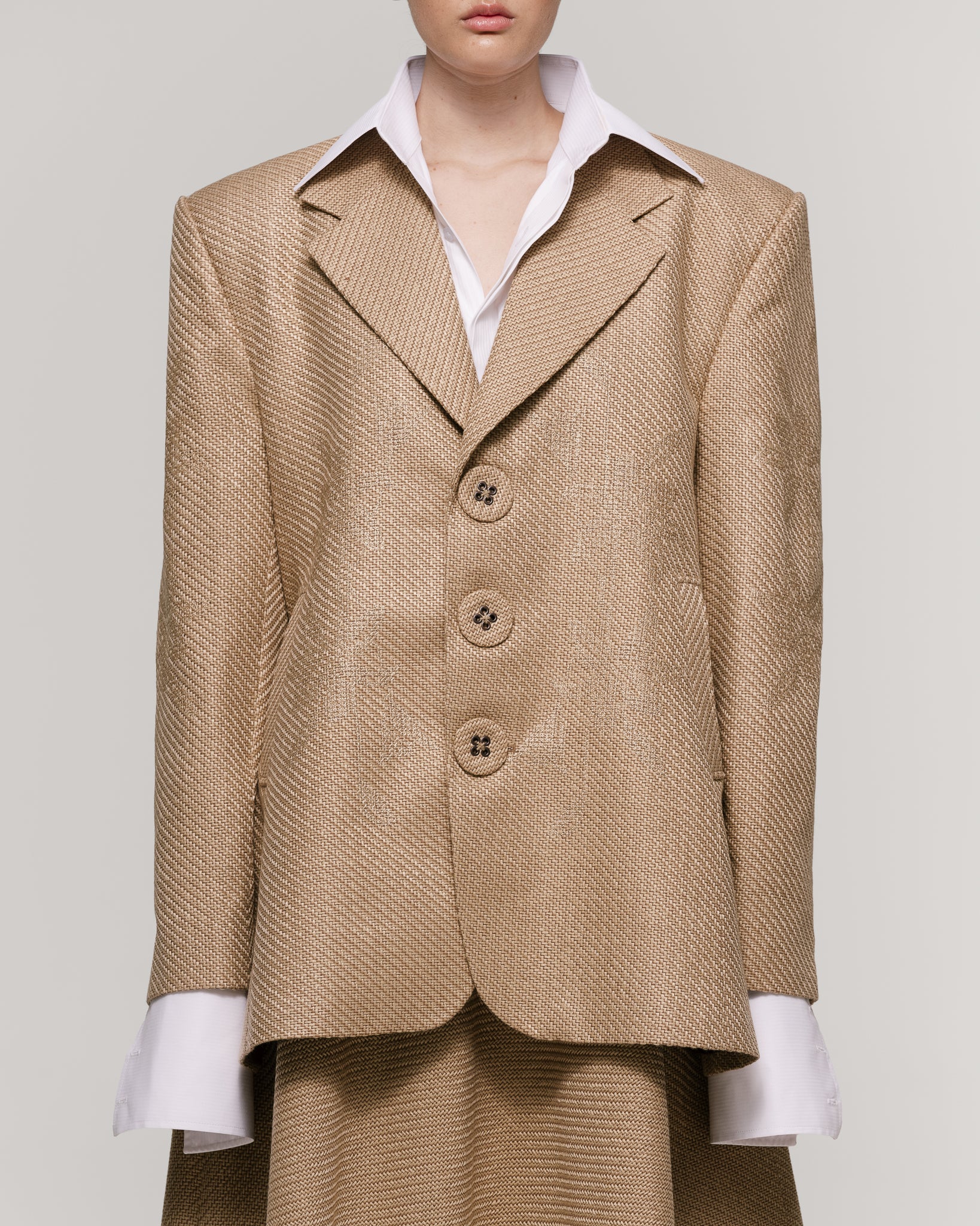 Chaqueta en yute beige, de solapa tradicional y cierre de 3 botones. De silueta acampanada gracias a su volumen en el posterior, bolsillos diagonales y hombros grandes. Botonadura