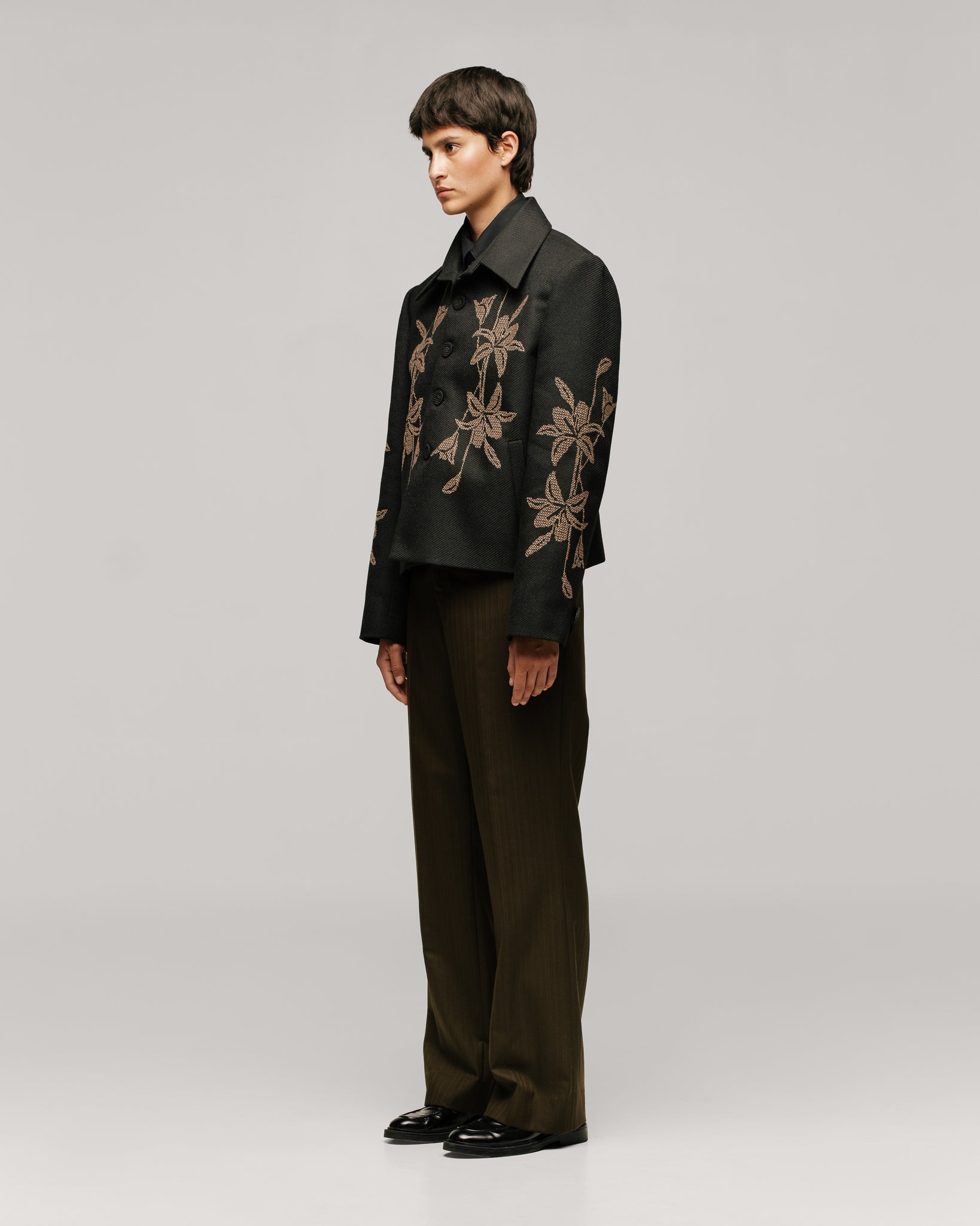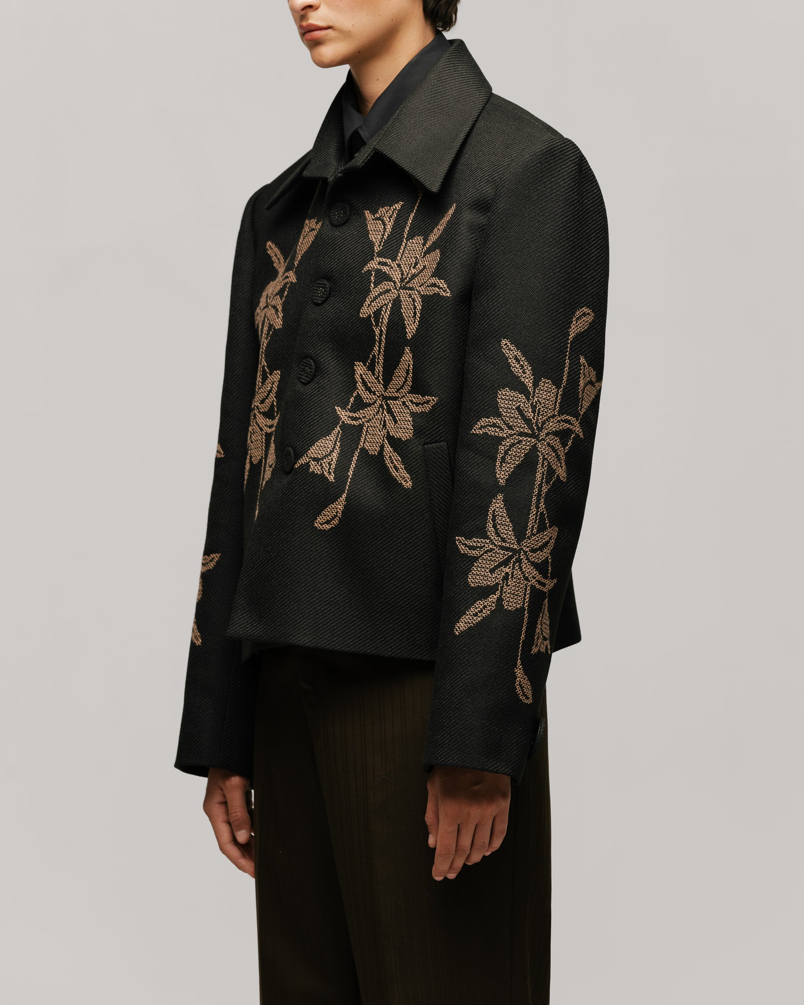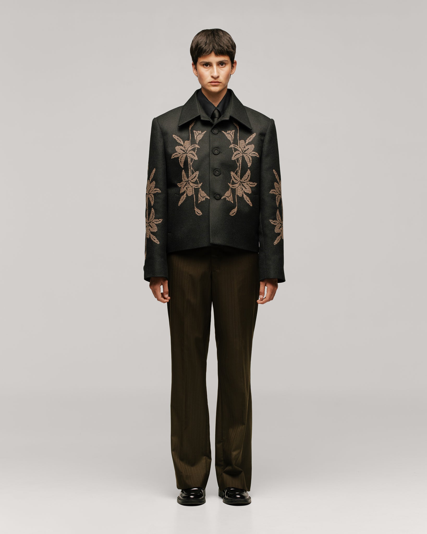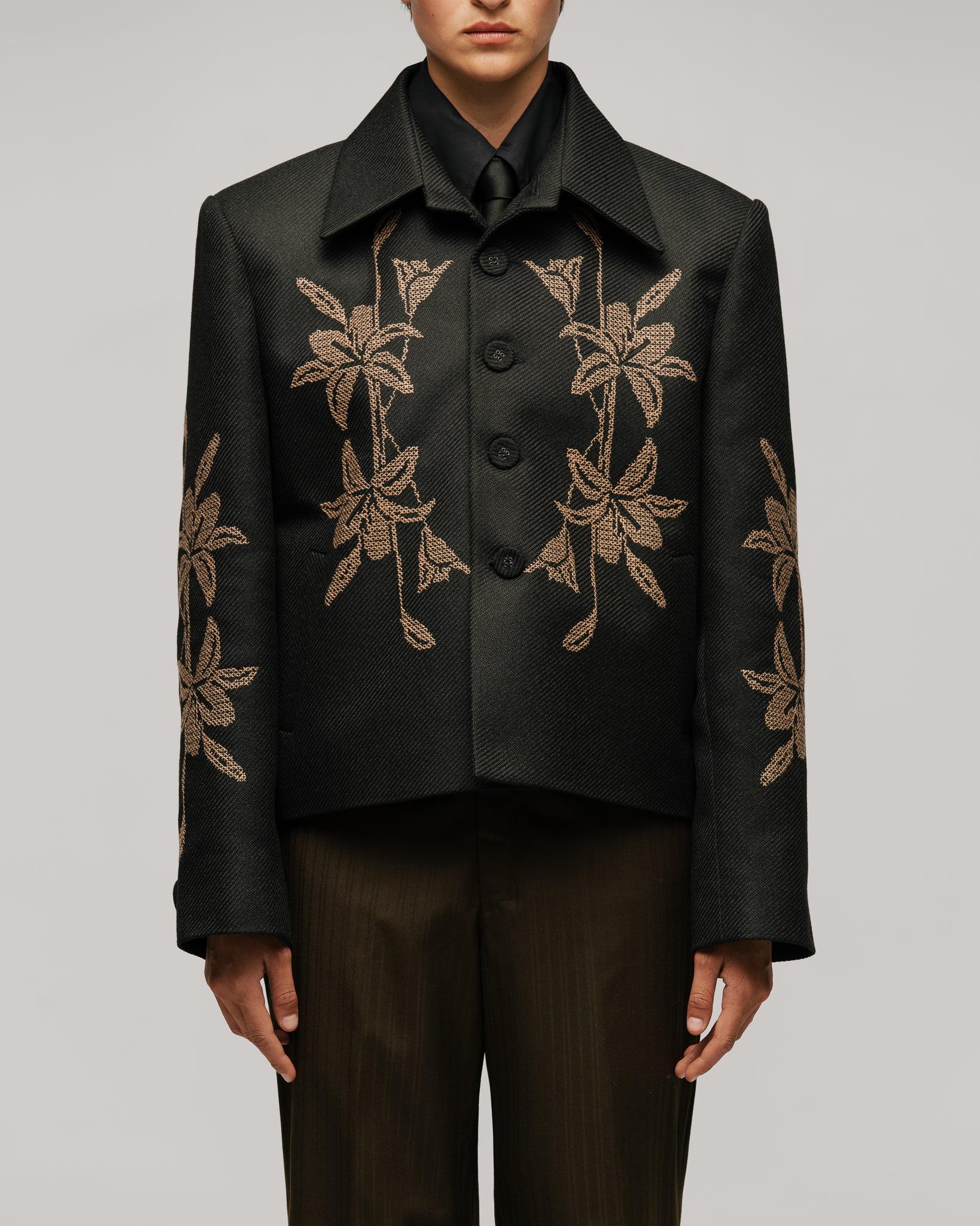 Chaqueta corta en tela de yute y poliéster, Silueta recta. Botonadura frontal con  botones forrados en tela. Cuello sport.  Bolsillos de ribete en diagonal. Bolsillo de pañuelo en el pecho. Motivo de flores bordado en técnica punto de cruz localizado en mangas y delanteros. Interior forrado en viscosa.