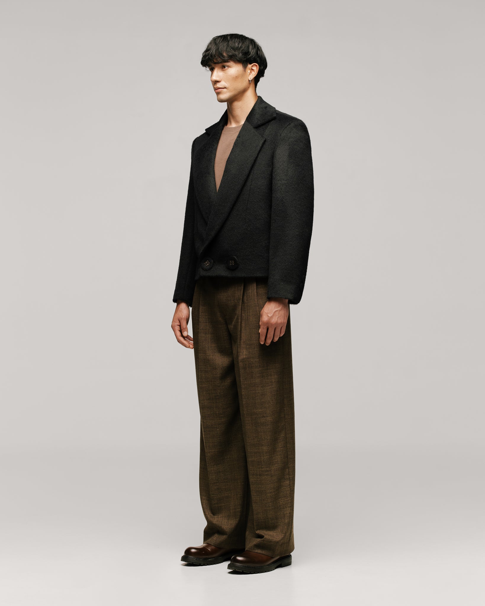 Chaqueta cruzada de 2 botones en paño de Alpaca. Solapa tradicional ancha, Hombros estructurados, Silueta recta, botones forrados, interior forrado en viscosa.