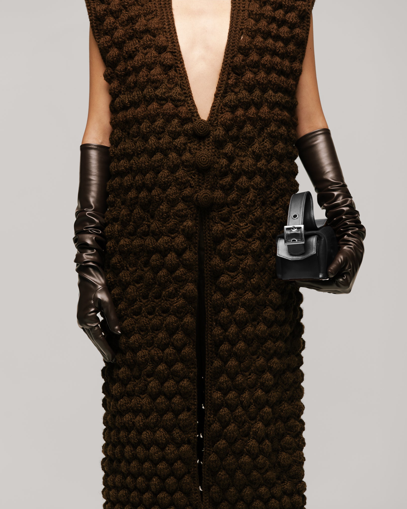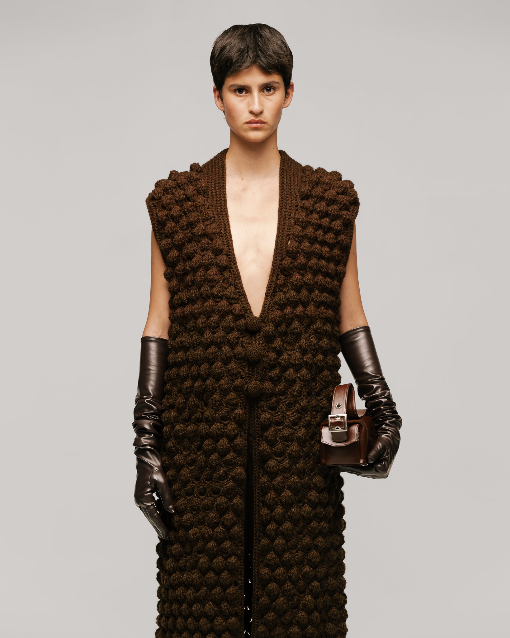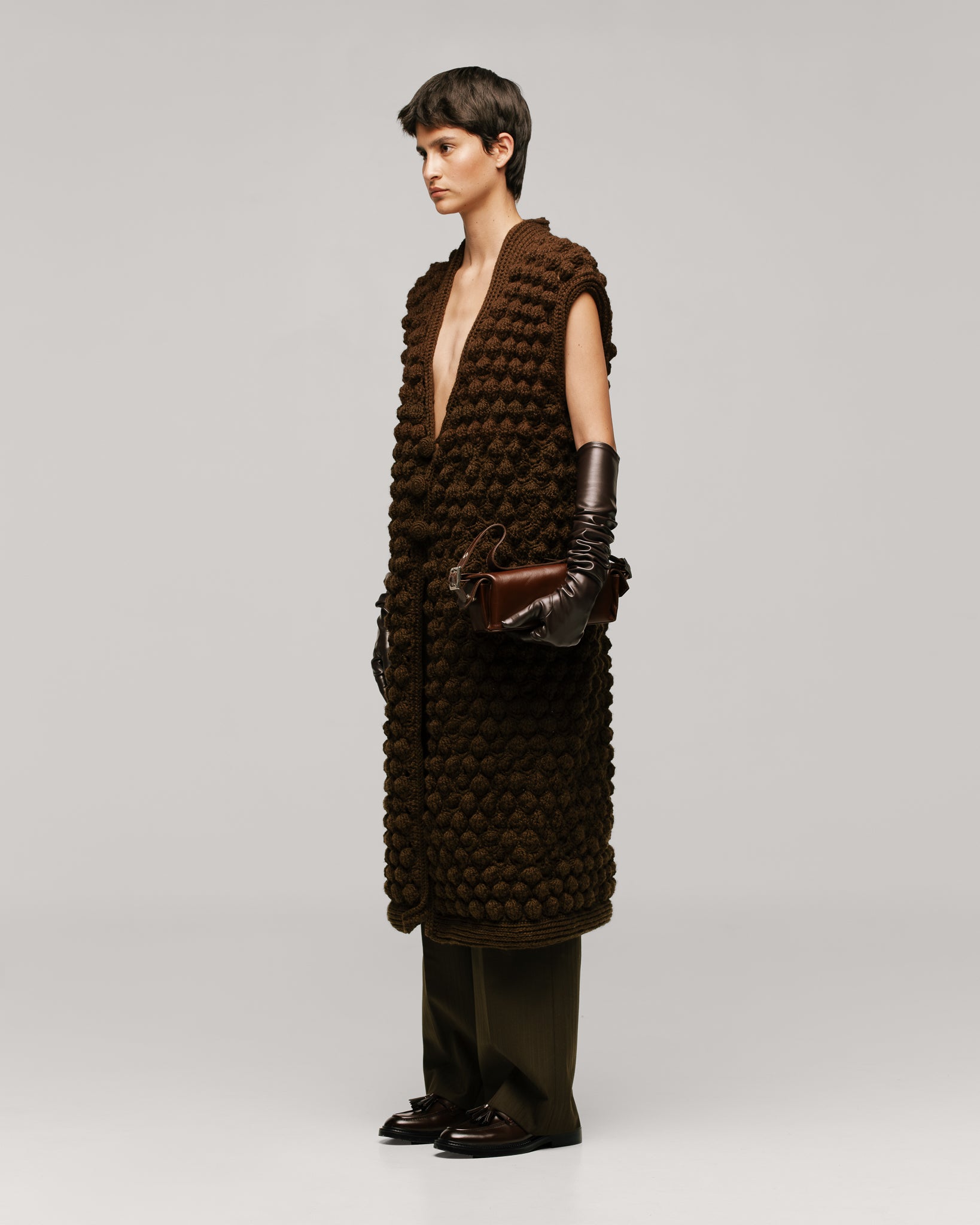 Chaleco de silueta recta, tejido totalmente a mano en técnica punto de cruz, puntada en forma de círculos con relieve. Escote en V profundo, botonadura frontal con 3 botones tejidos. Fibra de lana y acrílico.