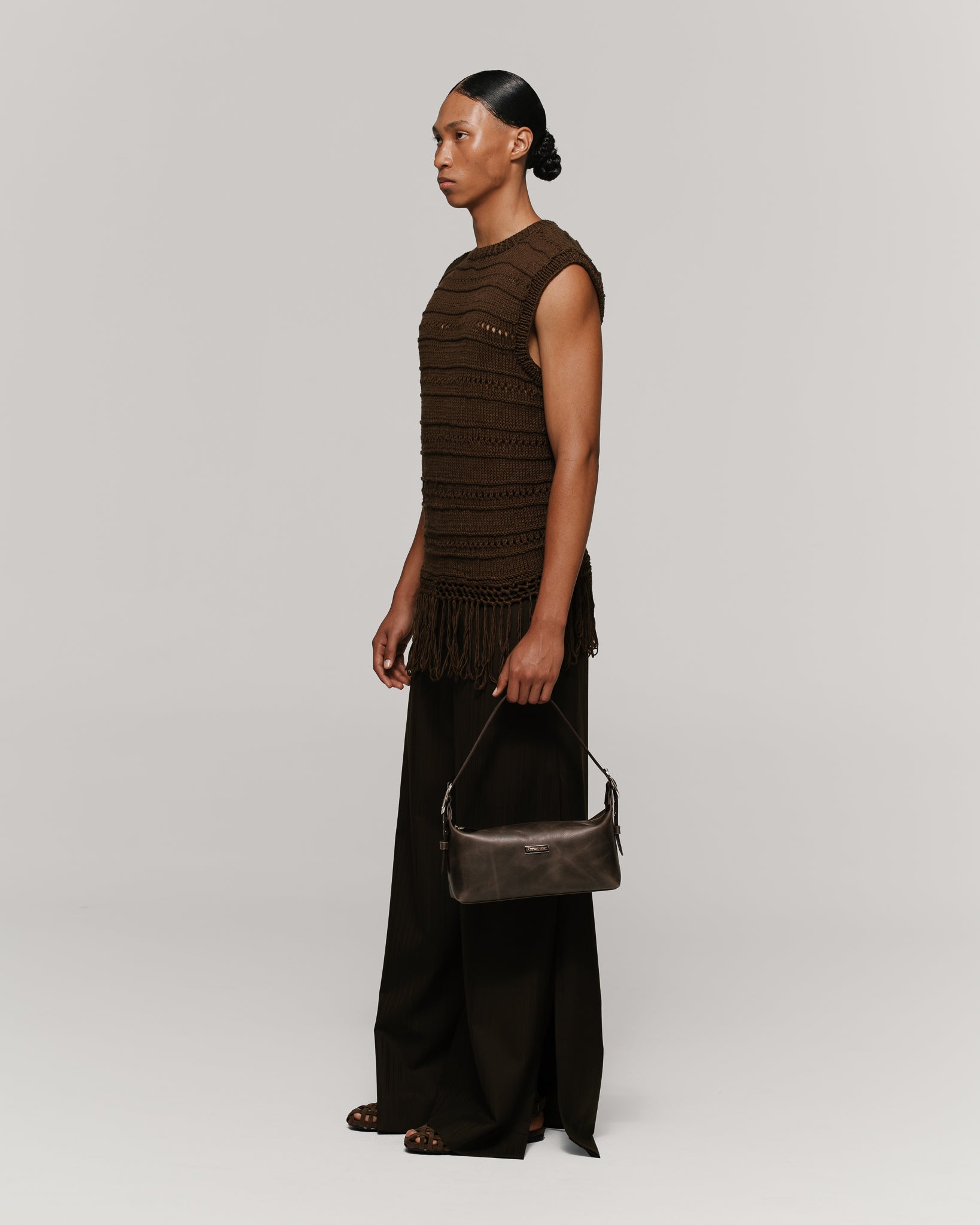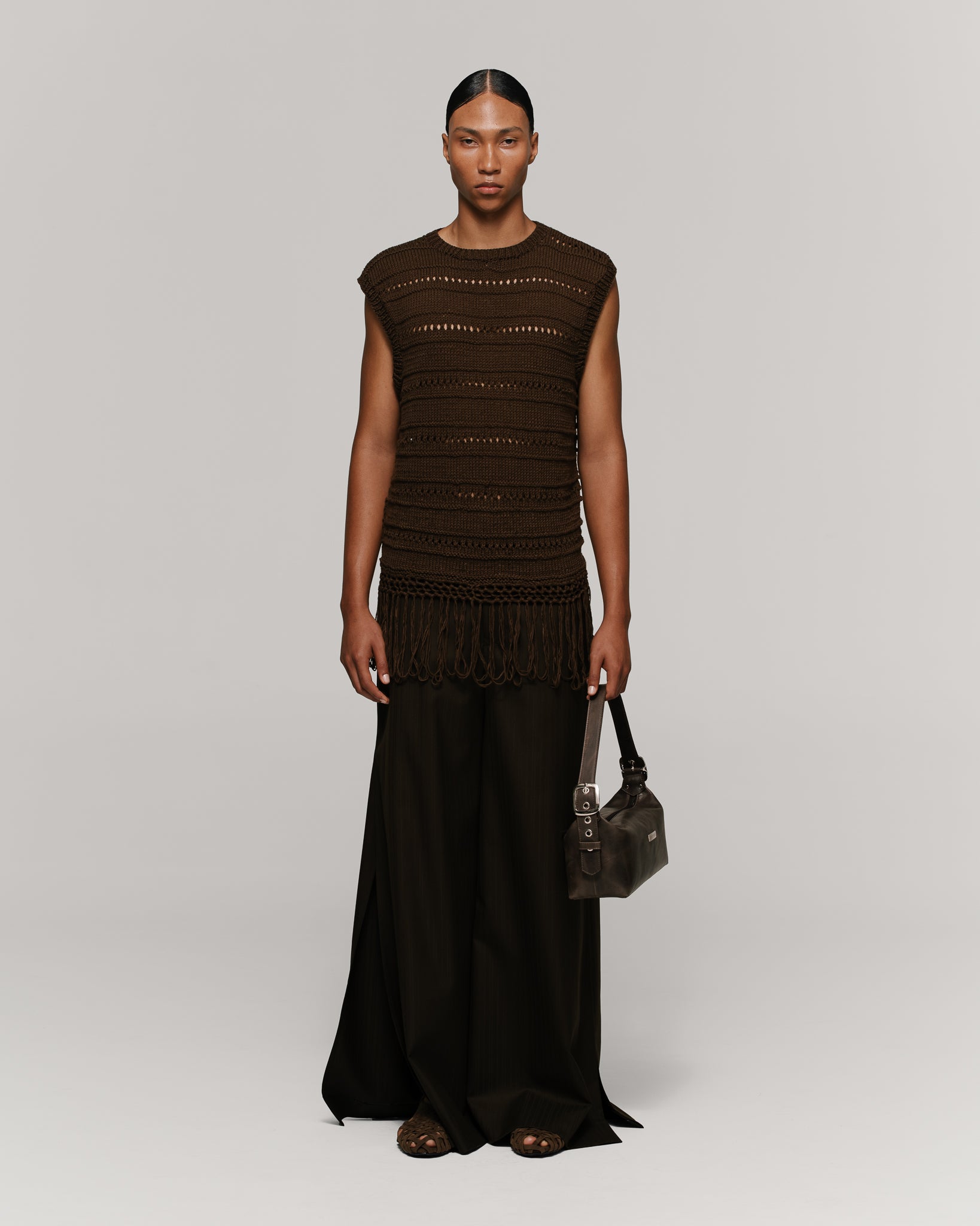 Chaleco en tejido chocolate, elaborado en técnica de crochet 100% a mano. Silueta recta y sin mangas, con terminación en flecos en la parte inferior. Pieza artesanal única.