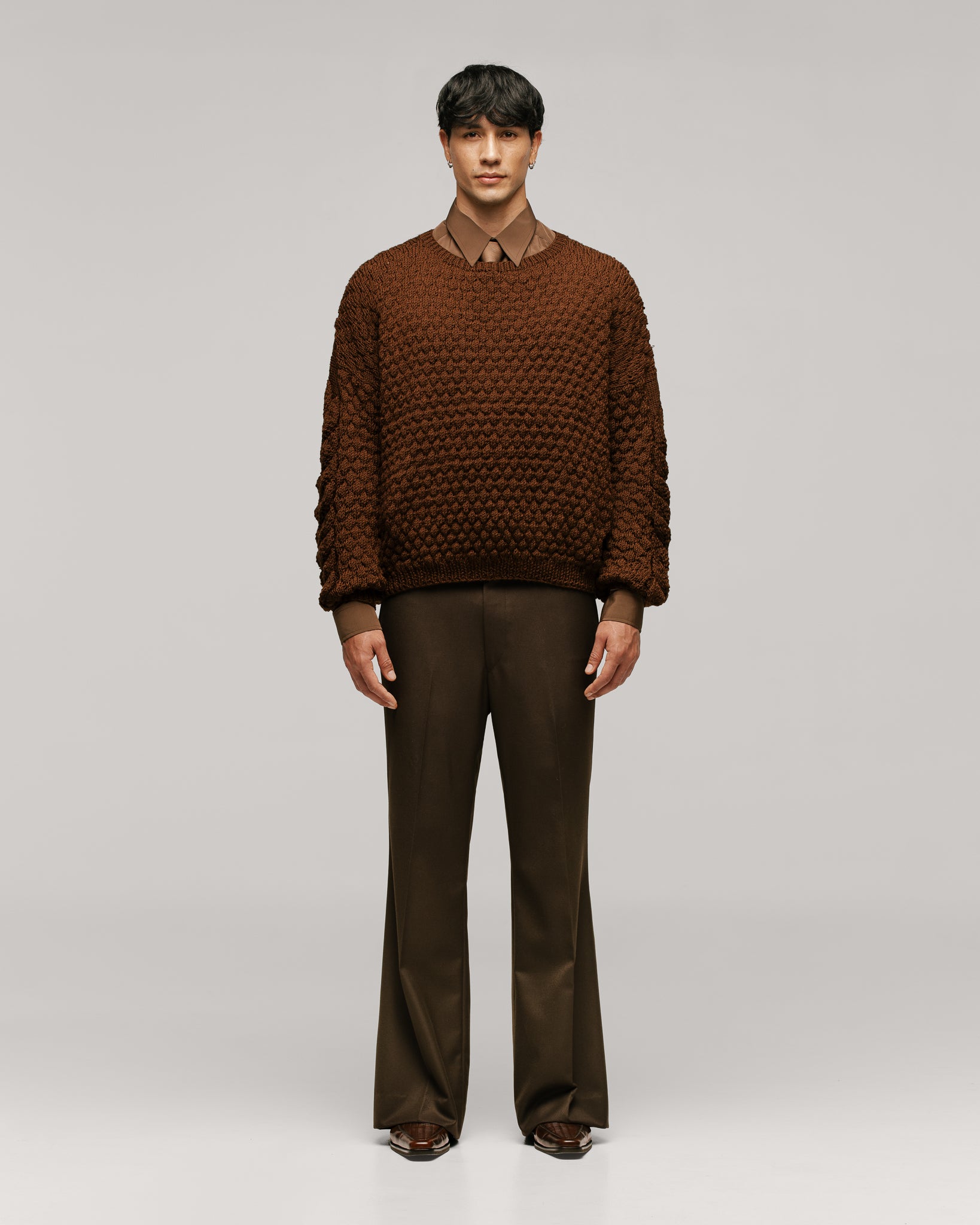 Sweater de silueta recta, hecho totalmente a mano en técnica de dos agujas con puntadas con formas orgánicas y puntas en forma de flores en las mangas. Cuello redondo. Fibra de lana y acrílico.
