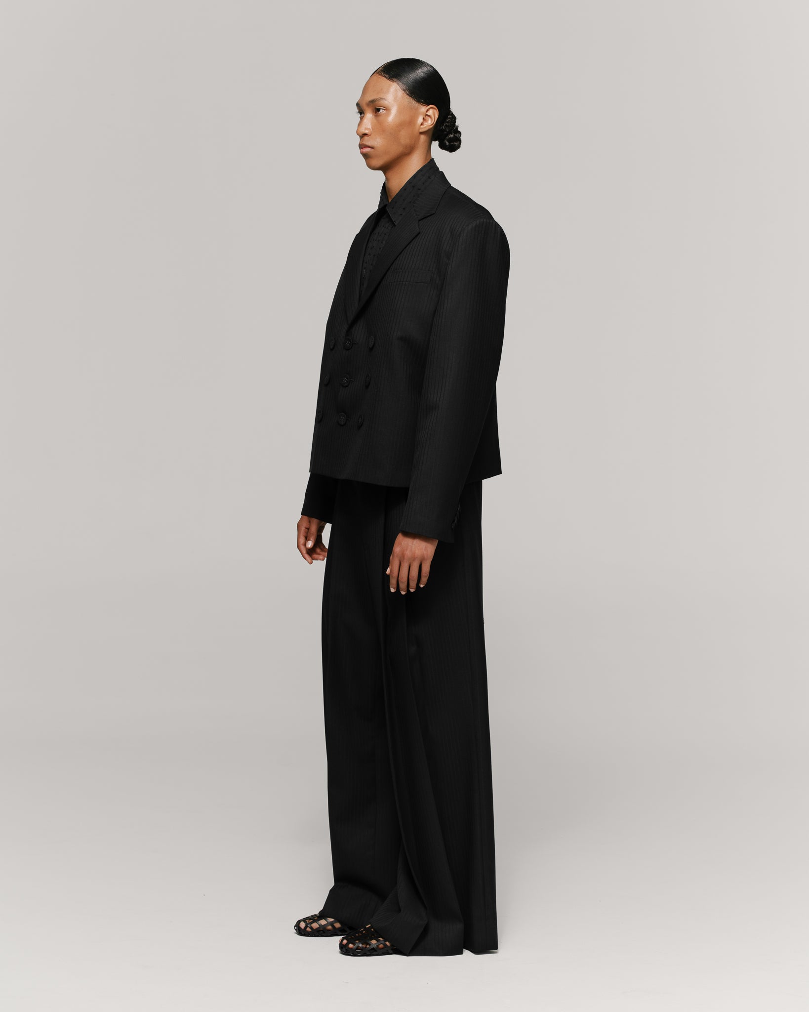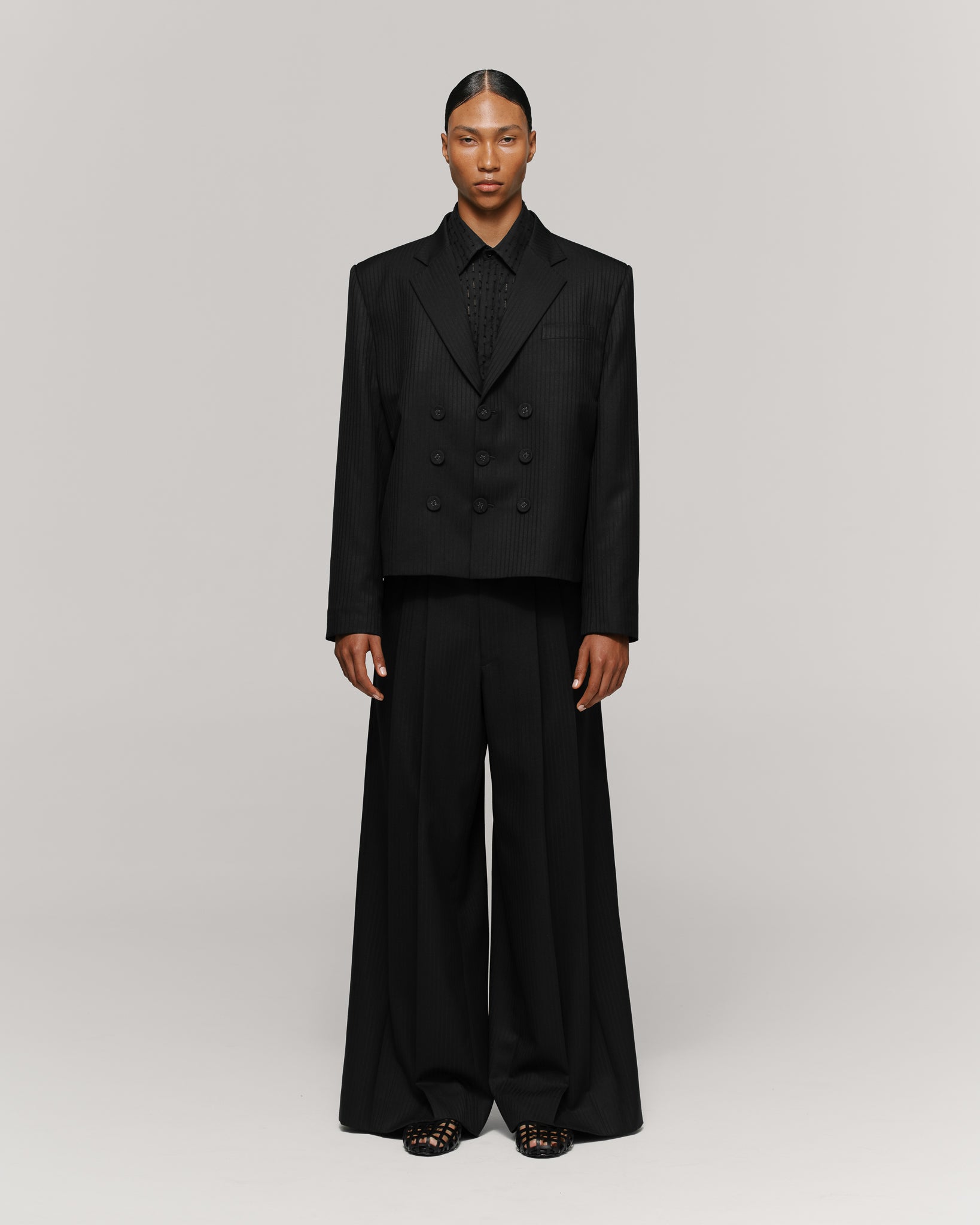 Traje de dos piezas en tejido negro con finas líneas al tono, compuesto por chaqueta de corte recto y silueta boxy, hombros estructurados y solapa tradicional. Botones forrados en la misma tela. Interior forrado. Se complementa con un pantalón amplio de dos pliegues profundos al frente.