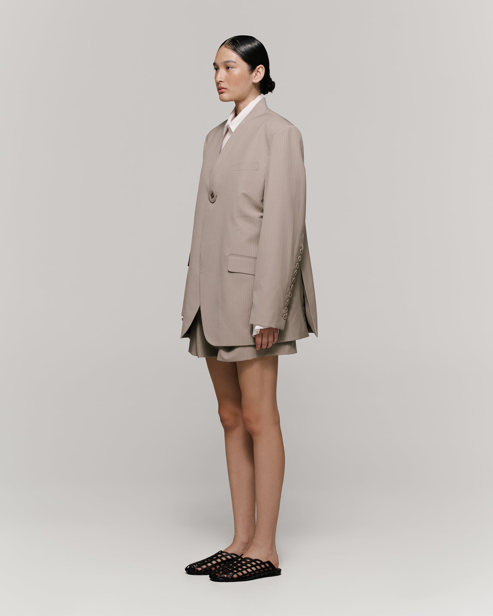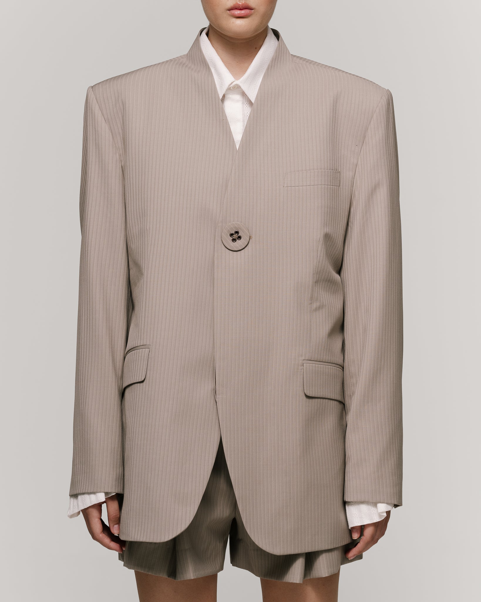 Traje de dos piezas en tejido gris con finas rayas a tono, se compone de chaqueta de silueta recta y sin solapa, cierra con un botón frontal expuesto y botones ocultos en el interior, con bolsillos de tapa. Botonadura funcional de diez botones en mangas. Interior forrado. Botones forrados en la misma tela. El short es de silueta amplia con un pliegue profundo.