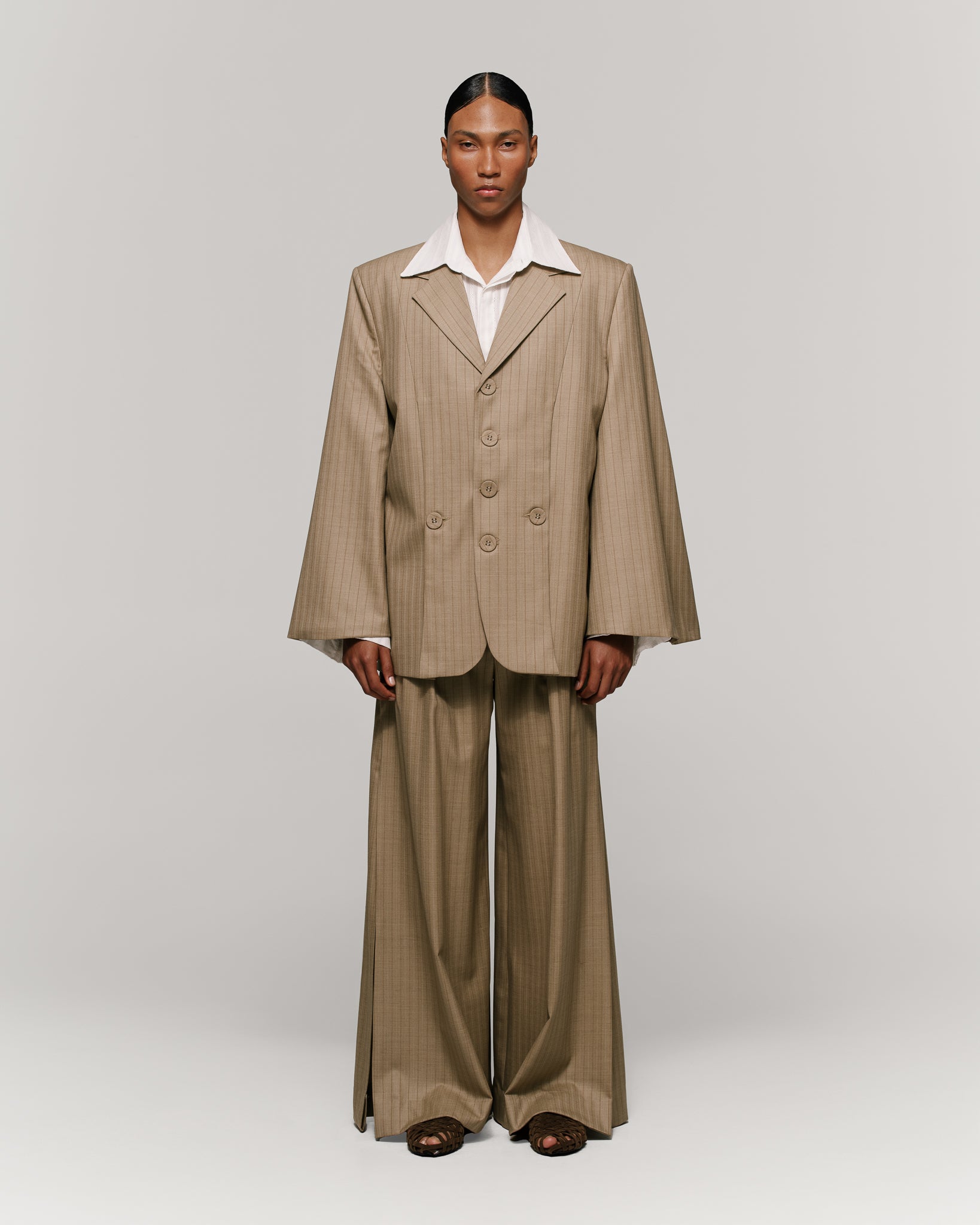 Traje de dos piezas en rayatiza, compuesto por chaqueta de solapa tradicional y cierre de cuatro botones, con aberturas en los delanteros que cierran con botón. Presenta mangas acampanadas y hombros estructurados. Interior forrado. Botones forrados en misma tela. Se complementa con pantalón de silueta muy amplia, con aberturas laterales.