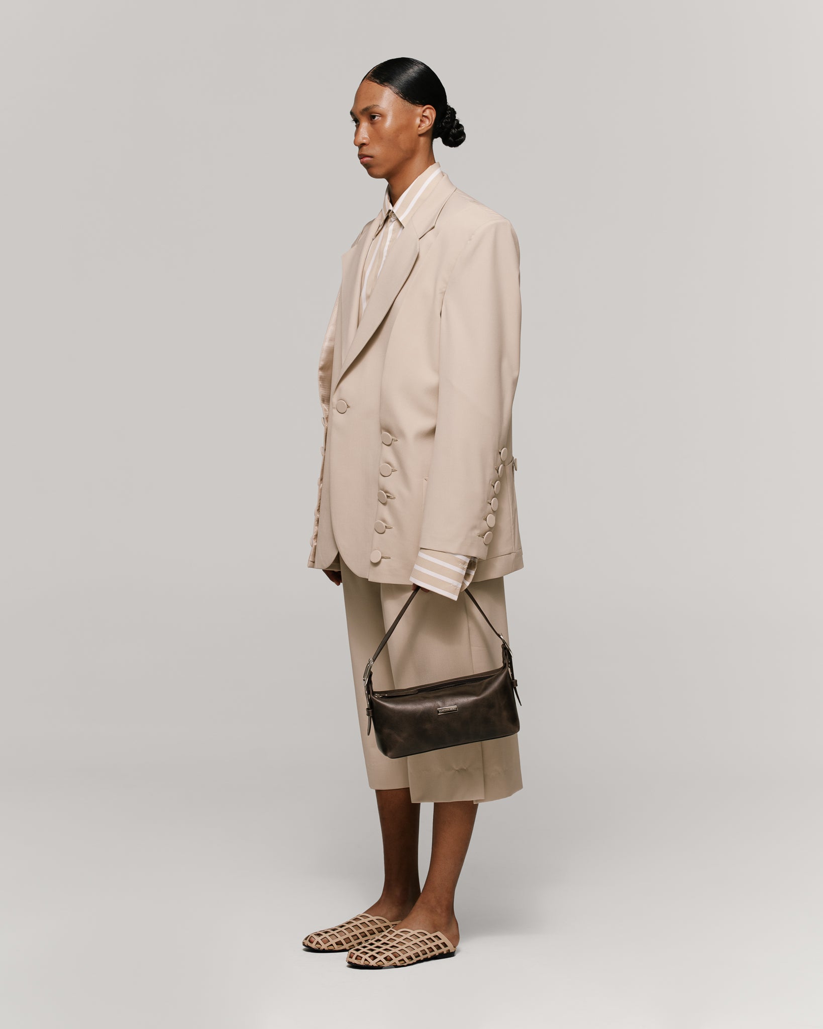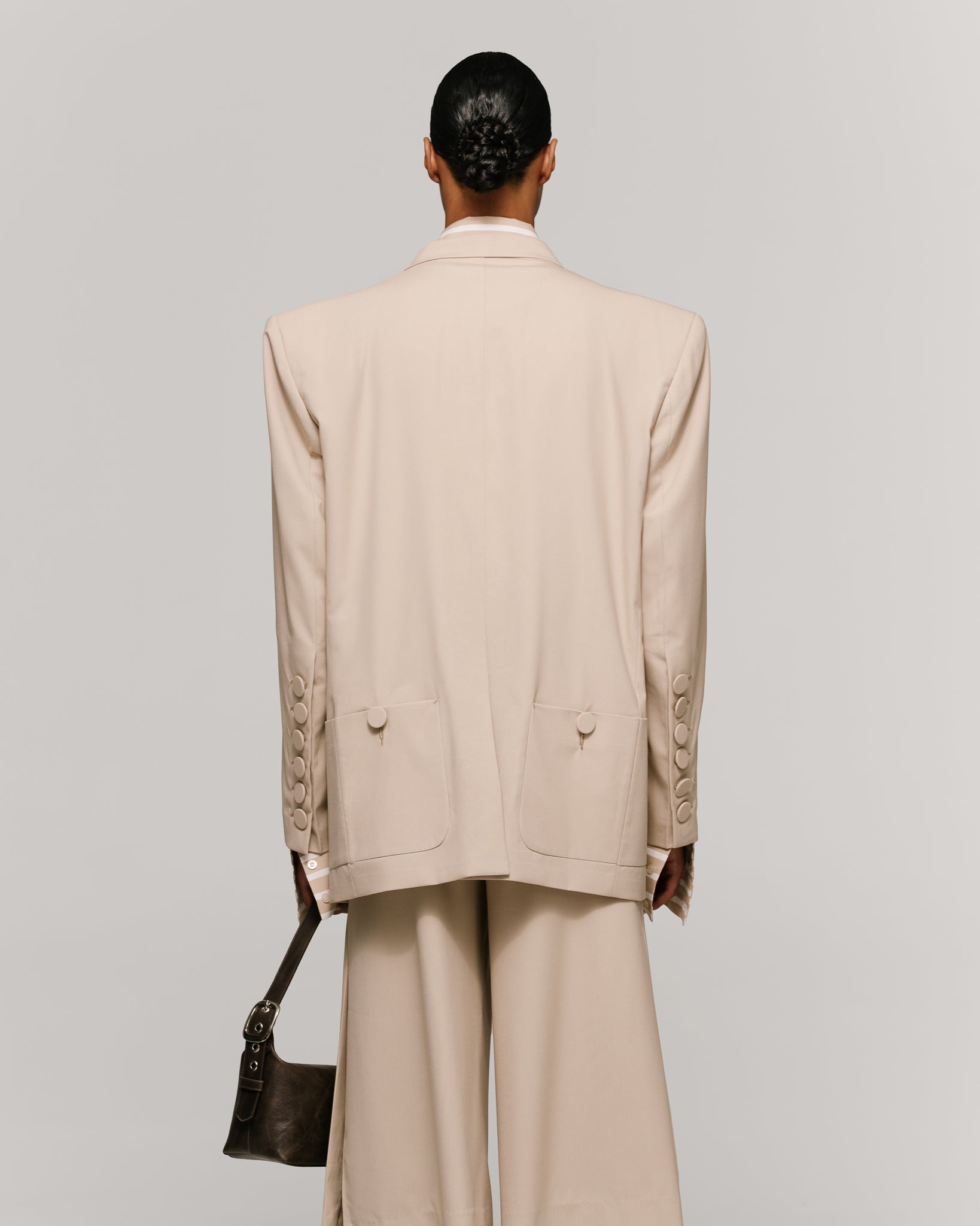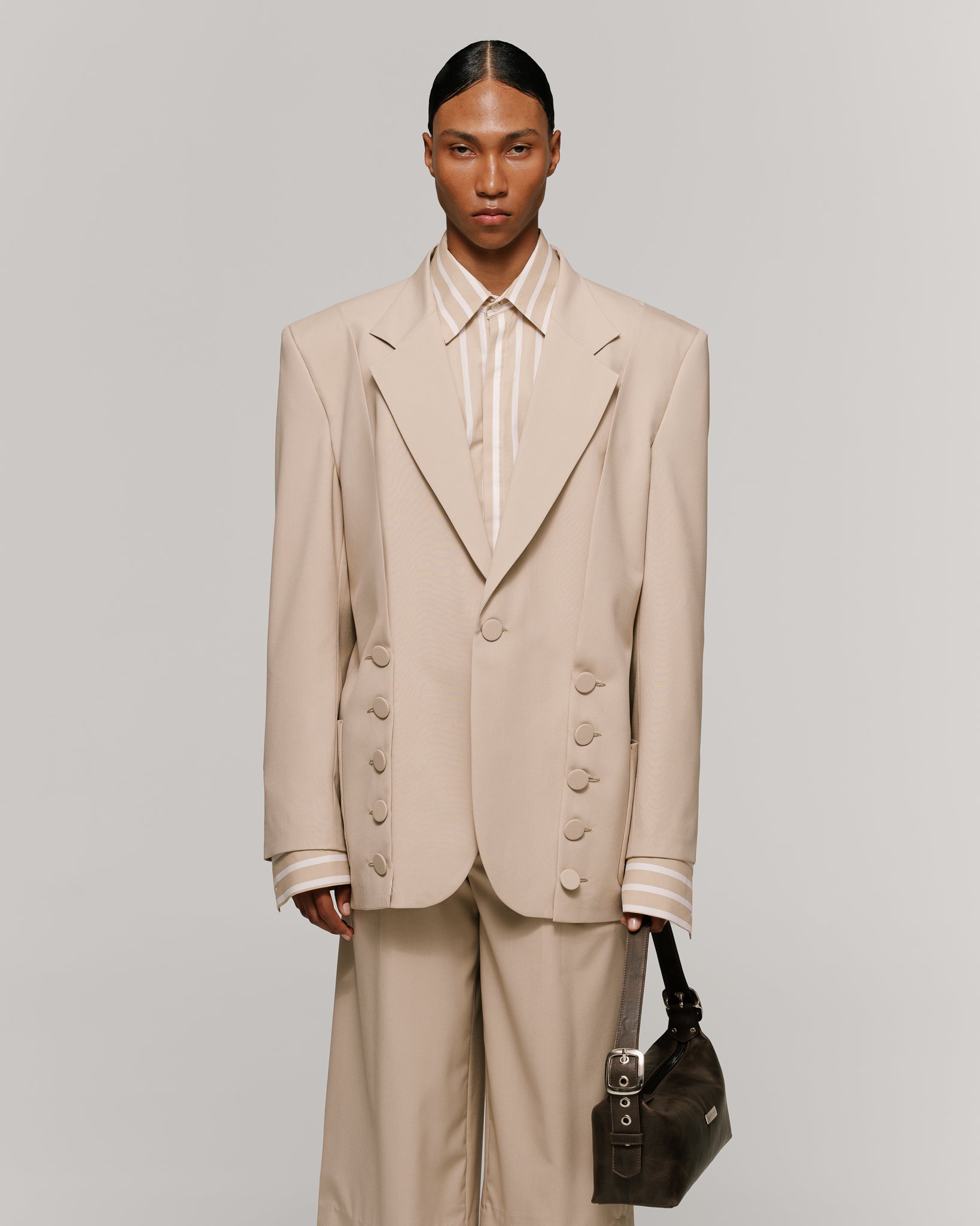 Traje de dos piezas en tejido beige, se compone de chaqueta de silueta recta y solapa tradicional. Presenta aberturas en delanteros que cierran con botones, con bolsillos de parche que cierran también con botón, las mangas tienen botonadura funcional de seis botones. Interior forrado. Botones forrados en la misma tela. La bermuda es de silueta amplia y recta.