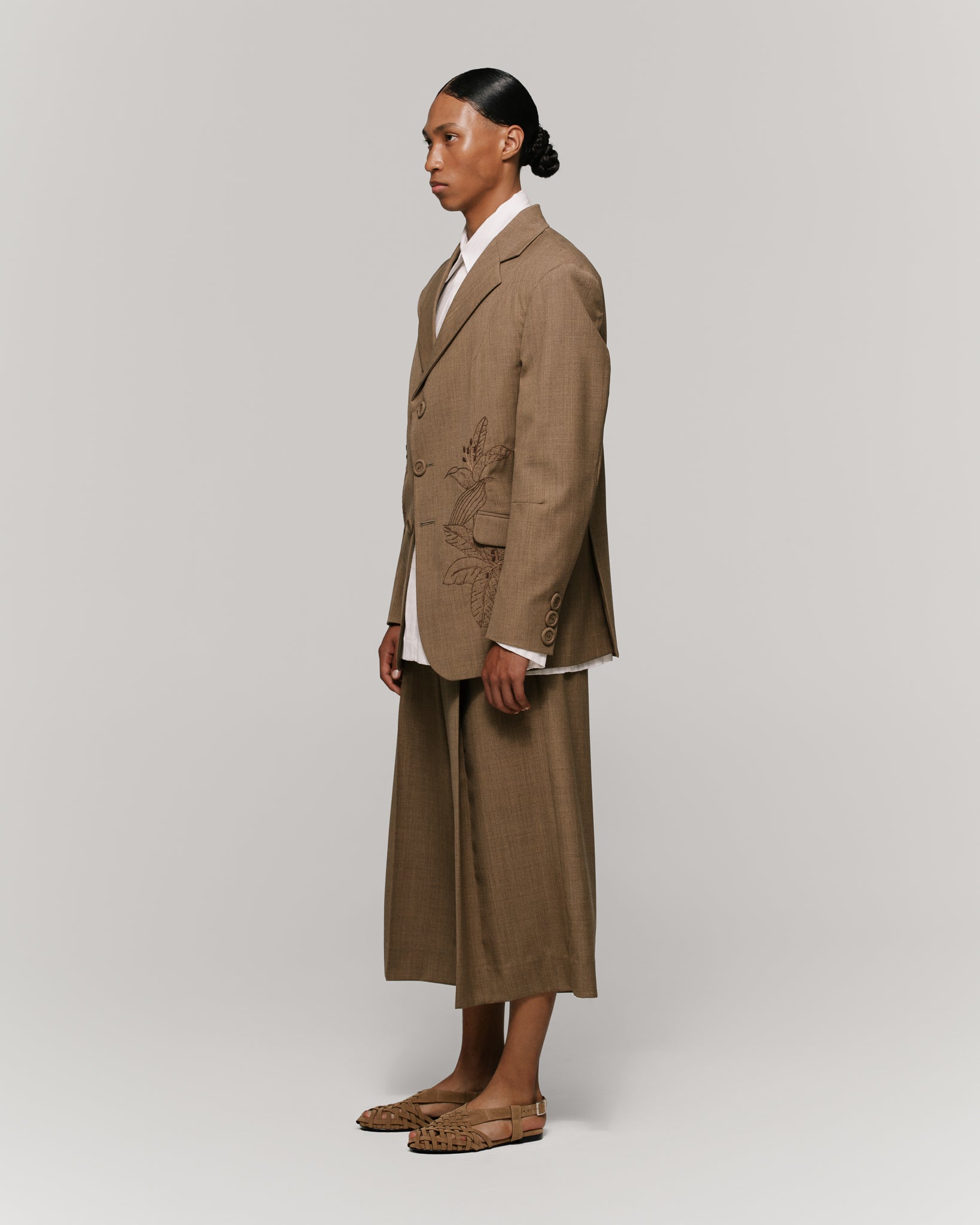 Traje de dos piezas en tono moka, compuesto por chaqueta de solapa tradicional y cierre de tres botones. Presenta bolsillos de tapa, pinzas en pecho y mangas, y hombros grandes. Intervenido con bordado artesanal de lirios a tono, 100% hecho a mano. Interior forrado. Botones forrados en misma tela. Se complementa con bermuda de un prense muy profundo,