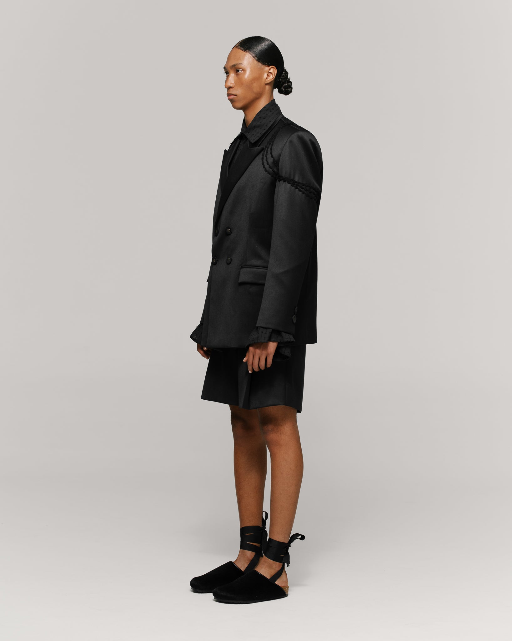 Traje de dos piezas compuesto por chaqueta cruzada de 4 botones, con solapa en punta recta, hombros estructurados y bolsillos de tapa. Intervenida con bordado artesanal en crochet, 100% hecho a mano, aplicado en pecho y mangas. Interior forrado. Botones forrados en misma tela. Se complementa con un short de un prense y bota amplia.