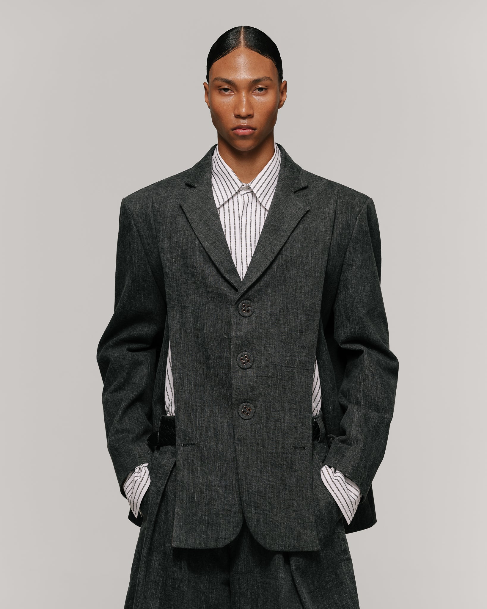 Traje de dos piezas en denim gris, compuesto por chaqueta de solapa tradicional y cierre de tres botones, con aberturas en los delanteros que cierran con botón. Presenta botonadura funcional de siete botones en los puños. Interior forrado. Botones forrados en misma tela. Se complementa con bermuda de silueta amplia y prense profundo.