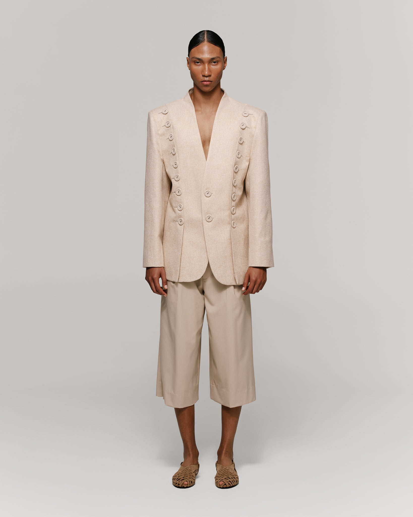 Chaqueta en tejido arena, sin solapa y cierre de 2 botones, presenta aberturas de nueve botones en delanteros. Silueta recta y hombros estructurados. Mangas con botonadura funcional de tres botones. Interior forrado. Botones forrados en la misma tela.
