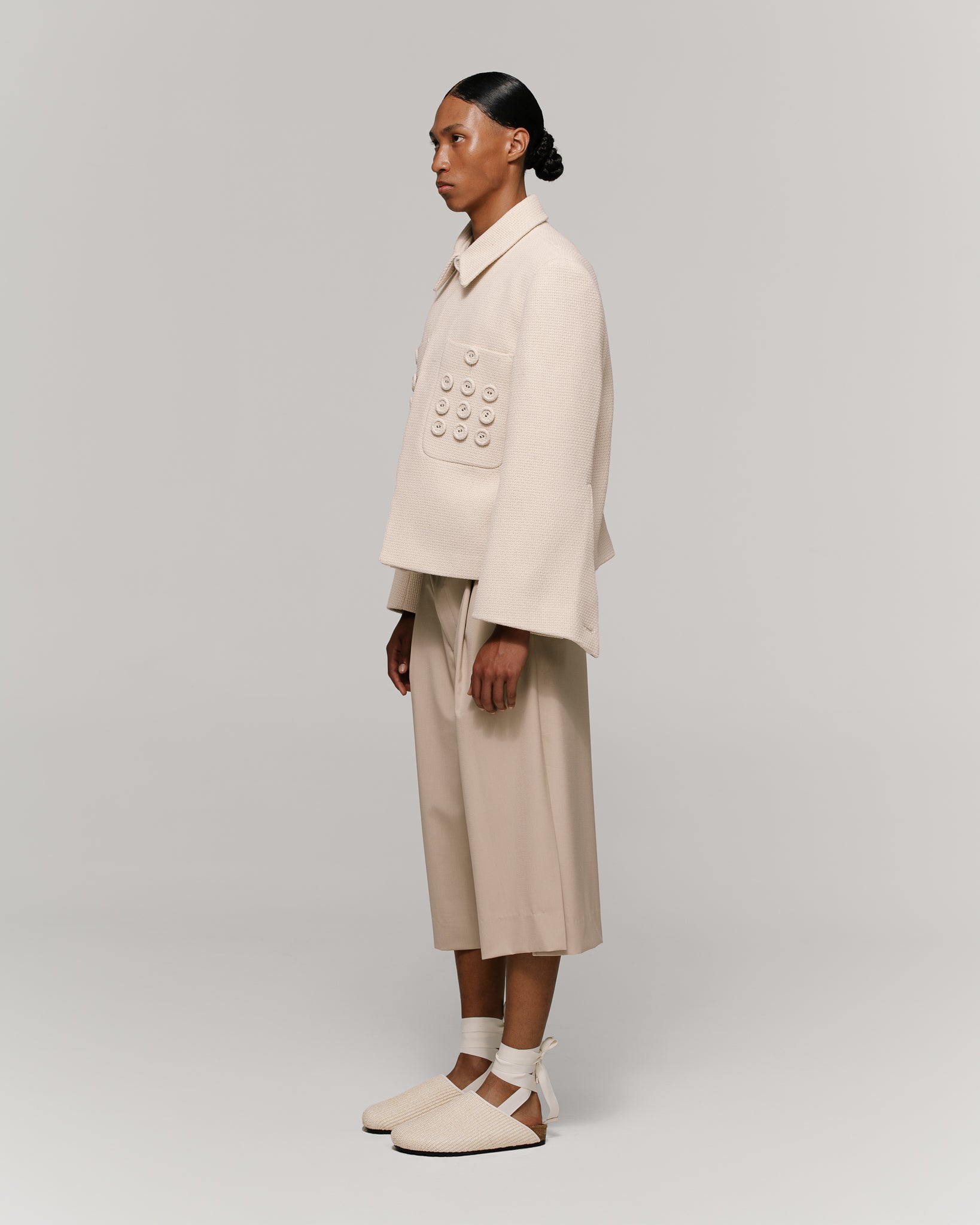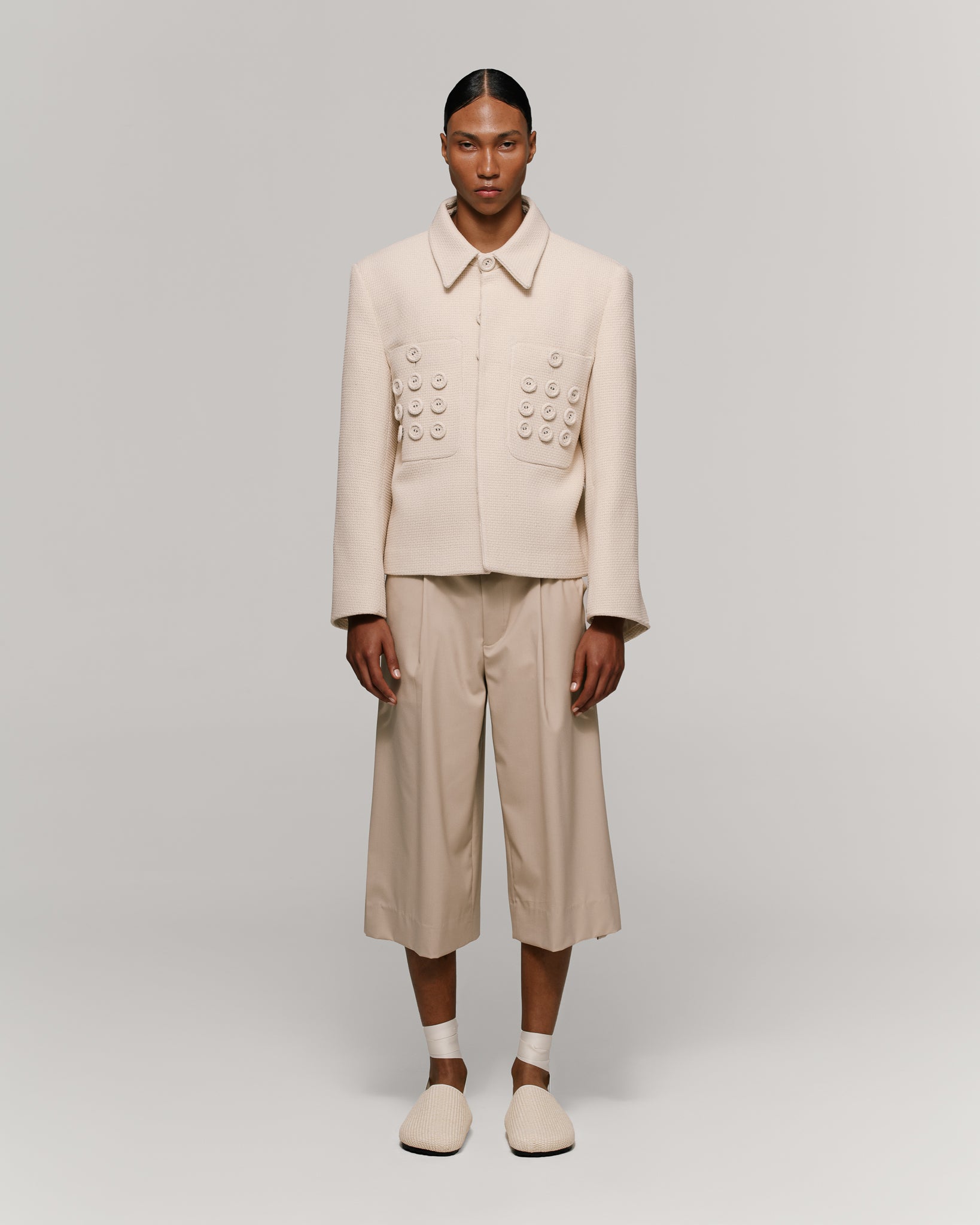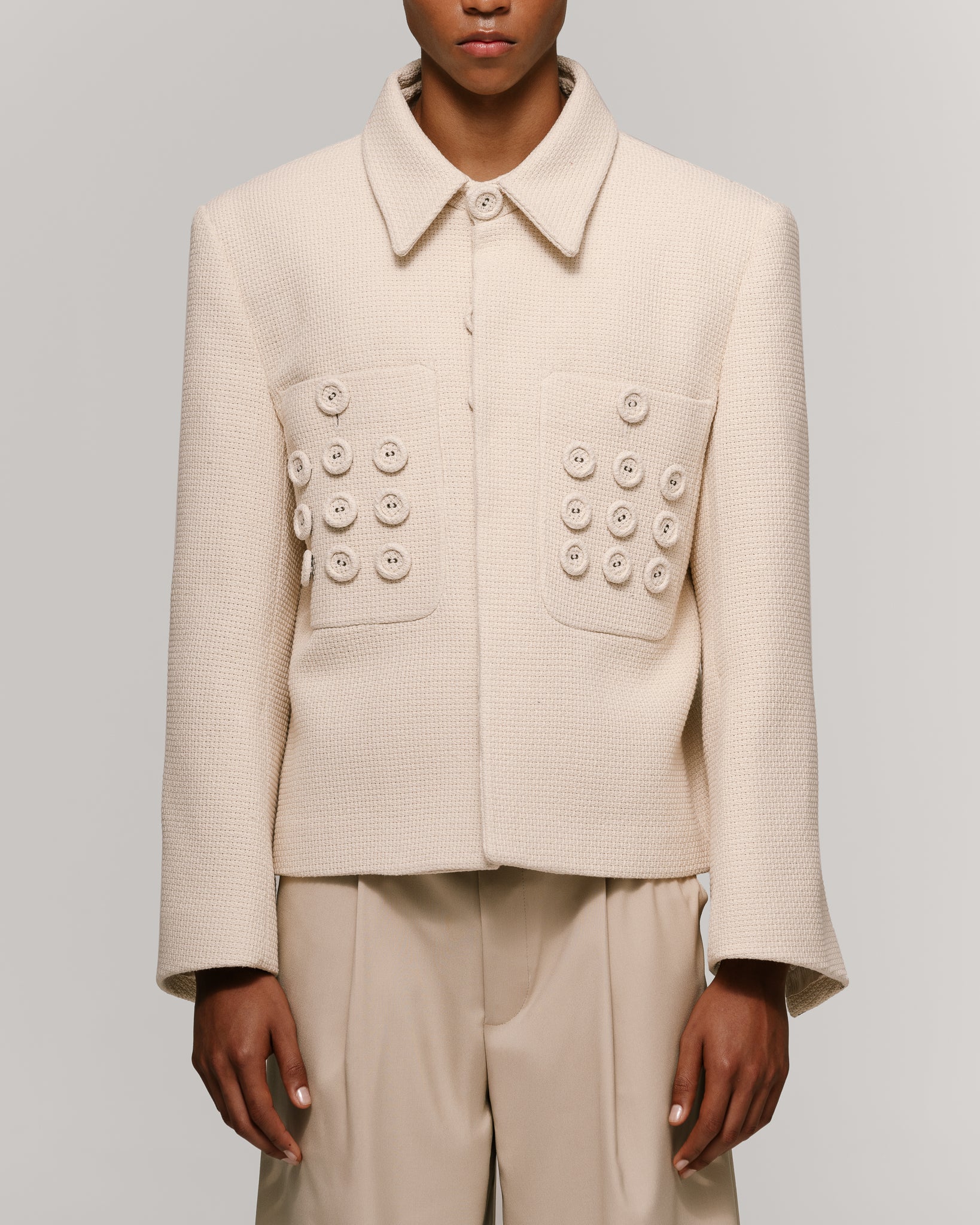 Chaqueta en tejido ivory, de silueta recta y boxy, con cuello sport. Presenta cierre frontal oculto y bolsillos de parche con botones forrados decorativos, manga amplia y envolvente. Interior forrado. Botones forrados en la misma tela.