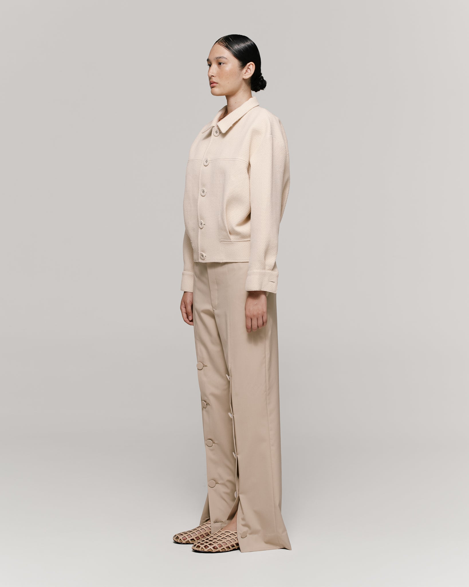 Chaqueta corta en tejido ivory, de cuello sport y cierre de 5 botones. La silueta tiene un volumen sutil gracias al corte con prense en la parte inferior, dando un efecto ligeramente abombado. Tiene hombro caído y manga larga amplia con puño. Interior forrado. Botones forrados en la misma tela.