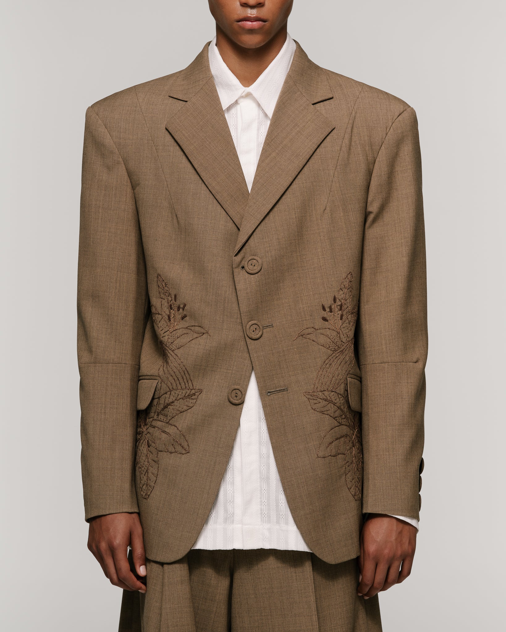 Traje de dos piezas en tono moka, compuesto por chaqueta de solapa tradicional y cierre de tres botones. Presenta bolsillos de tapa, pinzas en pecho y mangas, y hombros grandes.  Intervenido con bordado artesanal de lirios a tono, 100% hecho a mano. Interior forrado. Botones forrados en misma tela. Se complementa con bermuda de un prense muy profundo,