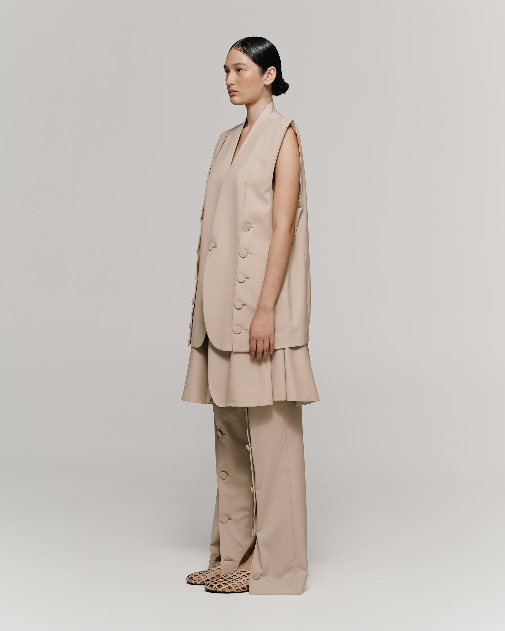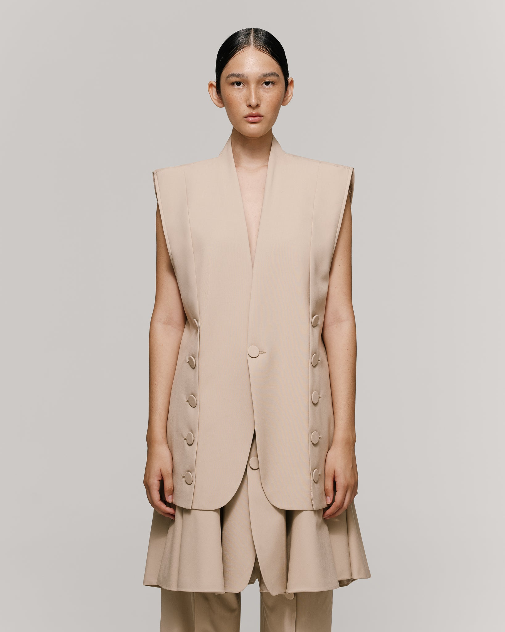 Traje de tres piezas en tejido beige, se compone de chaleco de hombros estructurados y sin mangas, con aberturas en delanteros que cierran con botones. Interior forrado. Falda amplia, cierre de 3 botones y con
