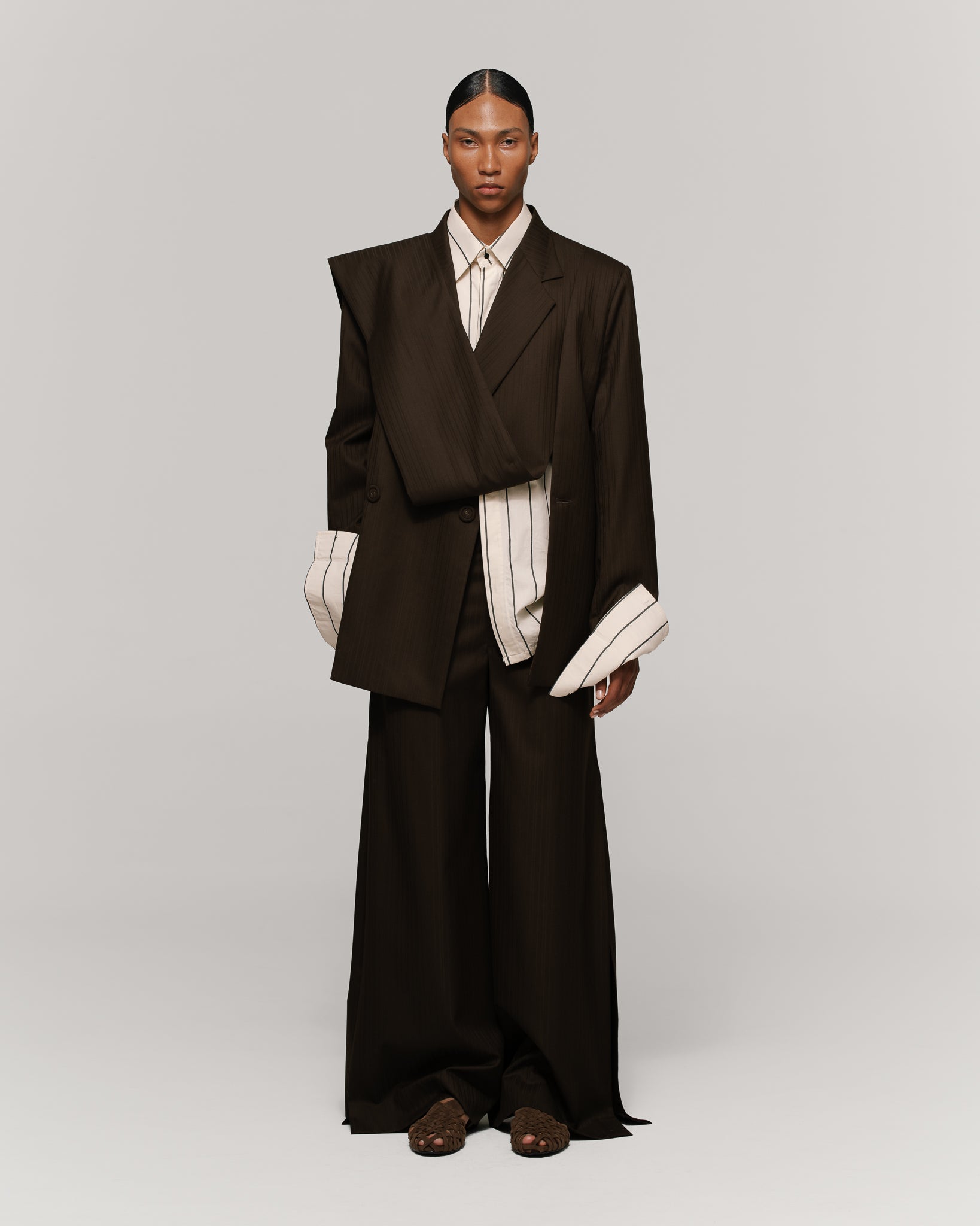 se cierran con botón y mangas con botonadura funcional de siete botones. Interior forrado. Botones forrados en misma tela. Se complementa con pantalón de silueta muy amplia, con aberturas laterales profundas.