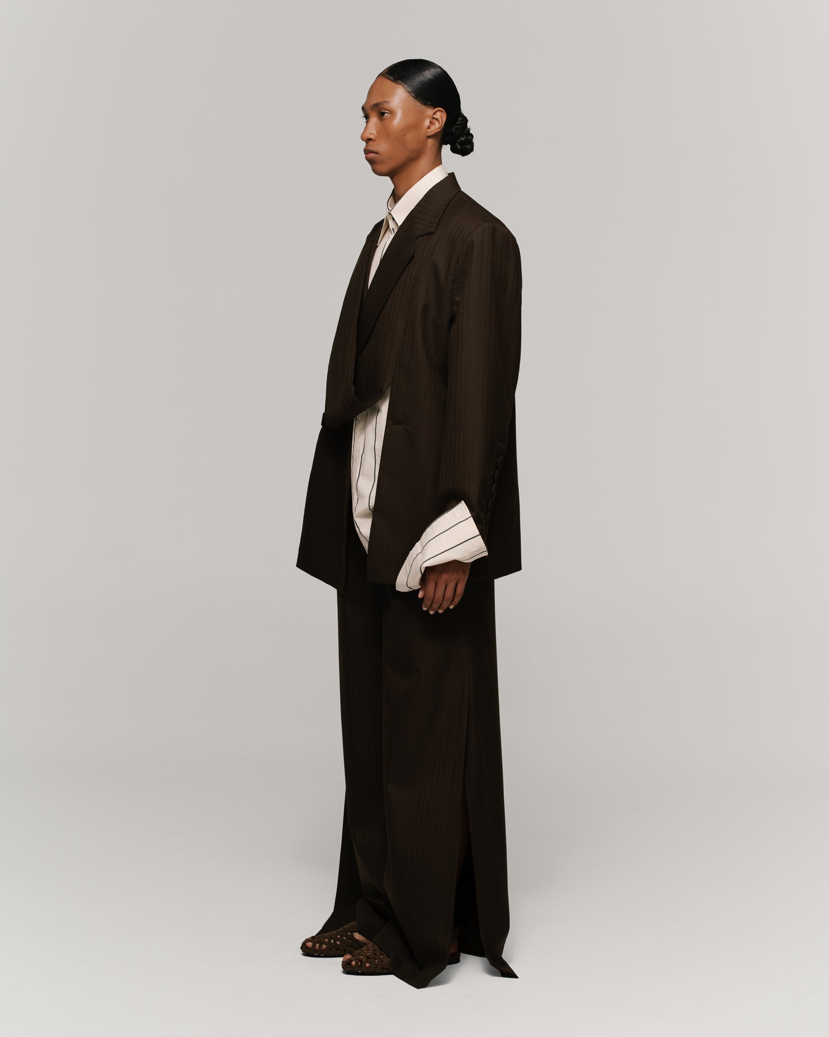 Traje de dos piezas en tejido café con líneas al tono, compuesto por chaqueta de solapa tradicional, su diseño incorpora un delantero más largo en uno de los lados, pensado para doblarse sobre el hombro y llevarse como ruana. Presenta aberturas en los delanteros que